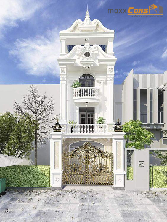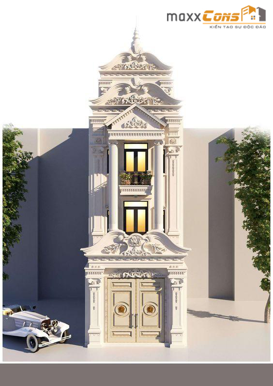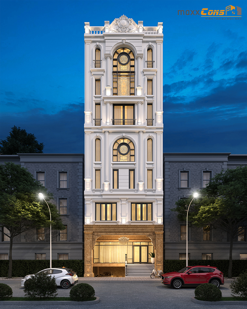 Một trong những sản phẩm thiết kế tiêu biểu về kiến trúc nhà phố tân cổ điển Pháp phải kể đến mẫu thiết kế nhà phố tân cổ điển 5 tầng với mặt tiền hẹp nhưng lại được thiết kế trau truốt họa tiết nổi bật không khác những lâu đài lộng lẫy