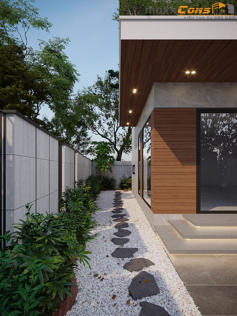 Lối mòn bên hông nhà xanh mát nhờ cây xanh kết hợp lối đi bằng đá phẳng kết hợp đá trắng viên như một con đường mòn bao quanh nhà. Yêu thích không gian này hãy liên hệ với kiến trúc maxxCons để được tư vấn thiết kế miễn phí quý khách nhé!