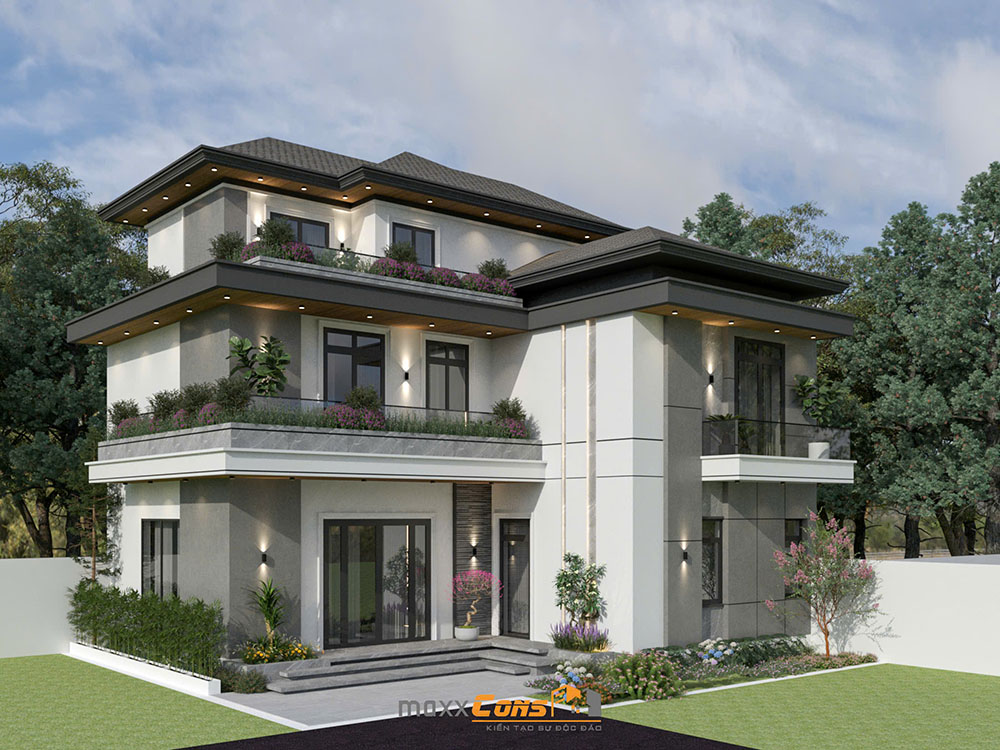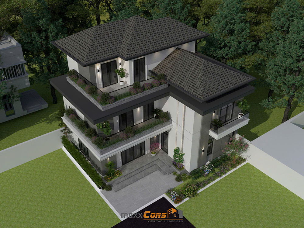 Mái Nhật là dạng mái có độ dốc vừa phải, mở rộng ra các phía, tạo cảm giác thanh thoát và bề thế cho tổng thể công trình. Khác với mái Thái có độ dốc lớn, mái Nhật mang lại sự mềm mại, tinh tế hơn, đồng thời giúp thoát nước mưa tốt và hạn chế hấp thụ nhiệt. Trong dự án tại Long Biên, maxxCons đã xử lý phần mái với tỷ lệ chuẩn, kết hợp màu ngói trung tính, giúp công trình giữ được vẻ sang trọng lâu dài, không lỗi thời theo thời gian.