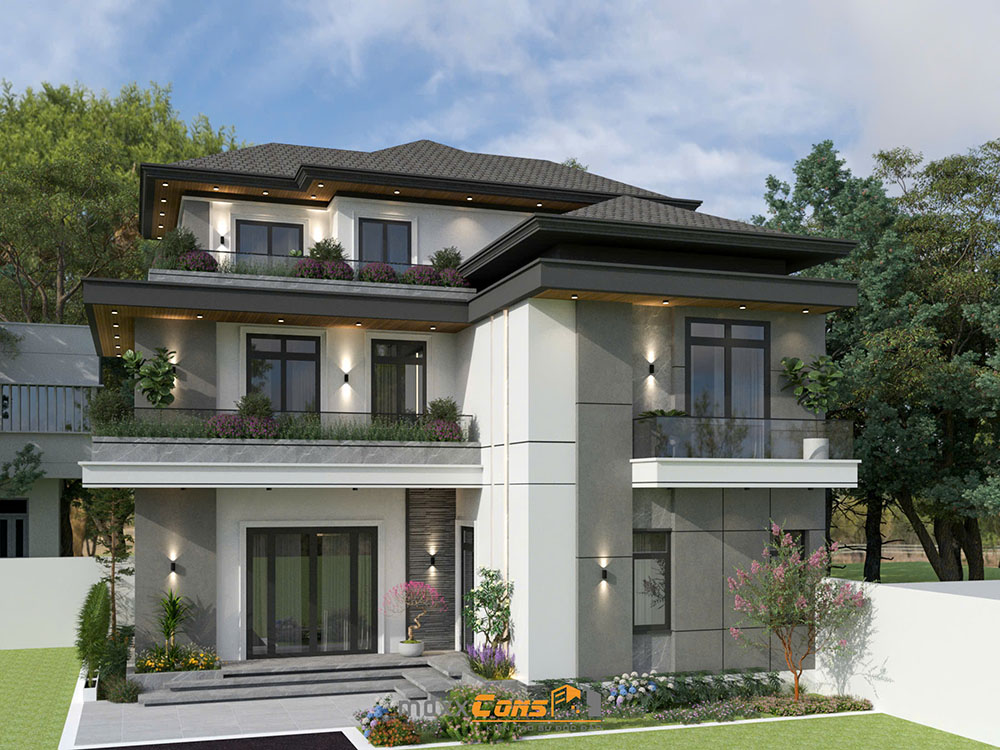 Tổng thể kiến trúc ngôi nhà được tạo hình theo phong cách hiện đại với các khối vuông vức, khỏe khoắn nhưng không hề thô cứng. Các mảng đặc – rỗng được bố trí hợp lý, kết hợp ban công rộng và hệ bồn cây xanh chạy dọc các tầng, mang lại cảm giác công trình “thở” cùng thiên nhiên. Mặt tiền sử dụng gam màu trắng – xám chủ đạo, điểm xuyết vật liệu ốp trang trí và hệ đèn ngoại thất tinh tế, giúp ngôi nhà nổi bật cả ban ngày lẫn khi về đêm.
