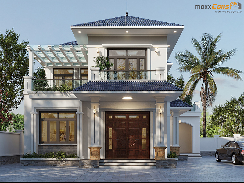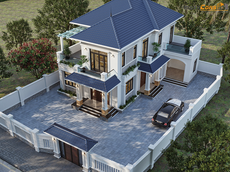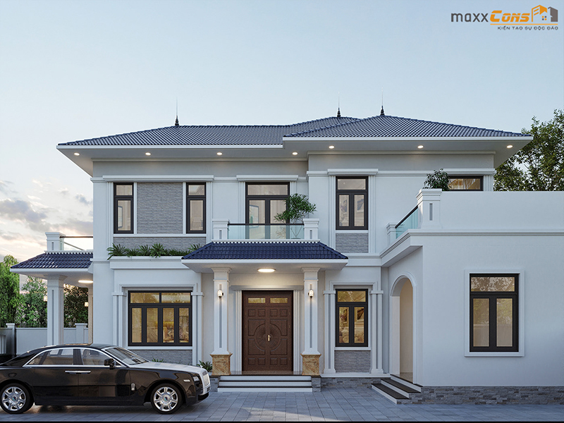 Biệt thự tân cổ điển được thiết kế với hai tầng chức năng với mặt tiền sơn trắng tinh tế kết hợp với mái ngói kiểu thái mài xanh xẫm hài hòa cả không gian