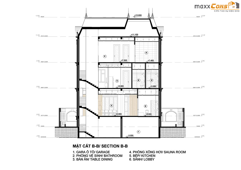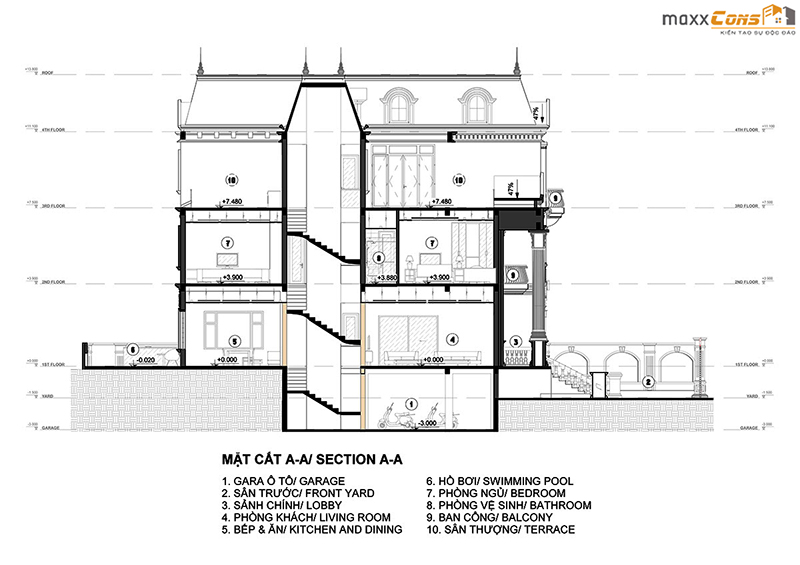 Mặt cắt không gian biệt thự 3 tầng tân cổ điển sang trọng