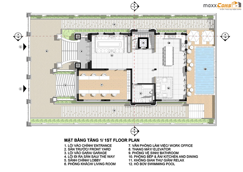 Mặt bằng không gian biệt thự tầng một với công năng chính gồm có: Lối vào sảnh chính, phòng khách, văn phòng làm việc, bếp và phòng ăn, không gian thư giãn và hồ bơi.