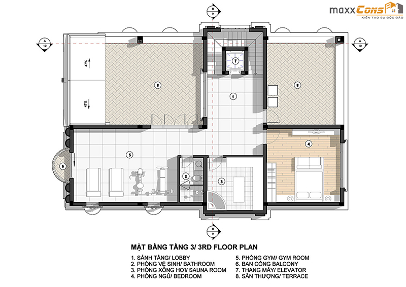 Mặt bằng bố trí công năng tầng 3 với không gian chính là phòng ngủ, phòng Gym, xông hơi và khoảng sân thượng