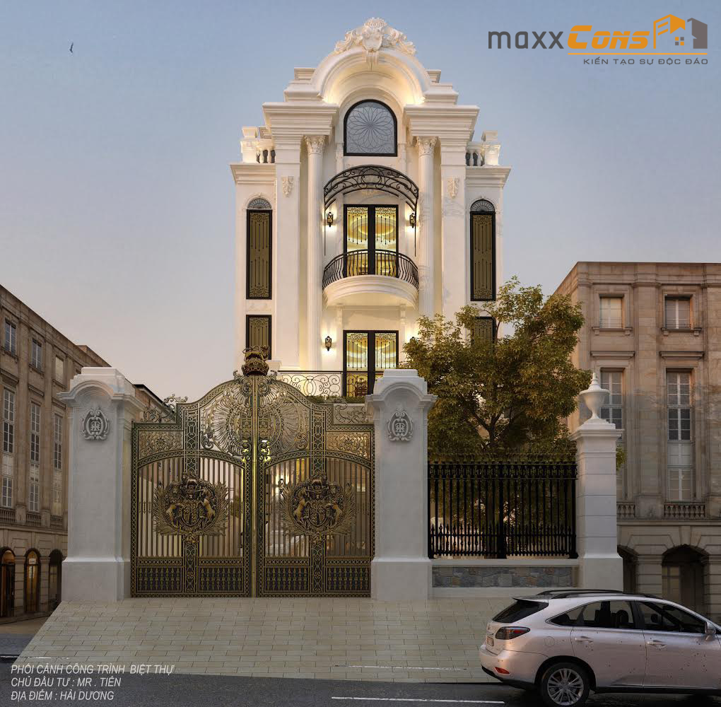 Biệt thự tân cổ điển 4 tầng thiết kế kiểu dáng Pháp đặc trưng chấm phá bằng một vài cách tân sáng tạo dựng nên công trình kiến trúc duyên dáng, quý phái, hoàng gia cân đối.