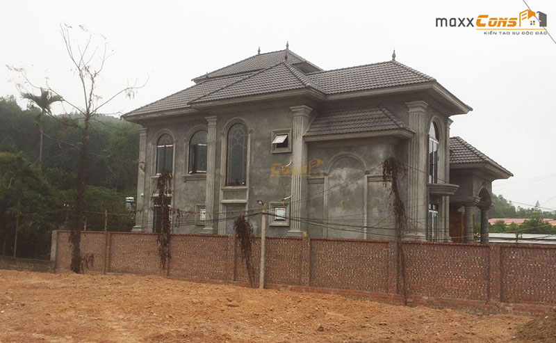 Ngôi biệt thự tân cổ điển đang trong quá trình thi công hoàn thiện nội thất. Tổng thể ngôi nhà được cân đối nhờ phần mái gọn gàng và đẹp mắt, đối xứng qua trục chạy qua mặt tiền nhà. Từng khu vực riêng của ngôi nhà lại có sự trang trí cân xứng riêng giúp cho nó trông vừa cần đối lại có sự bứt phá, sáng tạo, vượt ra ngoài khuôn khổ