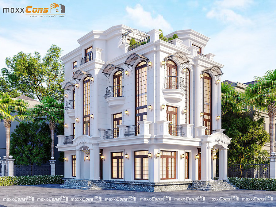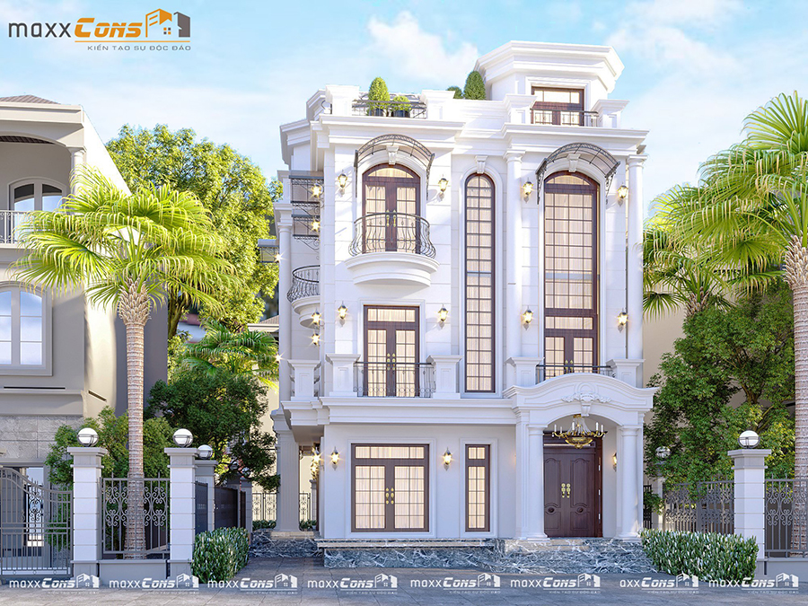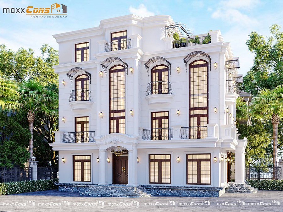 Mẫu thiết kế biệt thự tân cổ điển nổi bật với nguyên gam màu trắng tinh khôi được kiến trúc sư maxxCons thiết kế cho chủ đầu tư Chị Hoa - tại Mỹ Đình. Trong mẫu thiết kế biệt thự tân cổ điển nhẹ nhàng này kết hợp với chi tiến hoa văn đầy nghệ thuật trên các khung cửa.