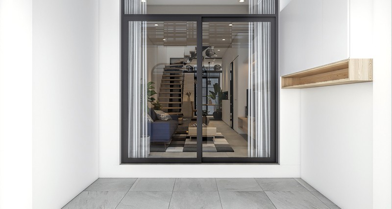 Cửa vào làm bằng kính khung nhôm, tăng khả năng bắt sáng ngăn bụi nhưng đảm bảo không gian trong nhà luôn ngập tràn ánh sáng tự nhiên