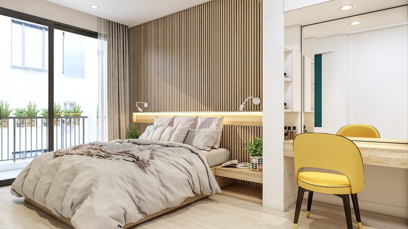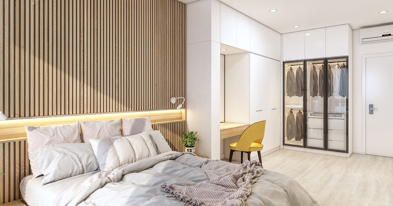 Tủ quần áo, bàn làm việc thiết kế âm tường khiến phòng ngủ càng thêm rộng rãi.
