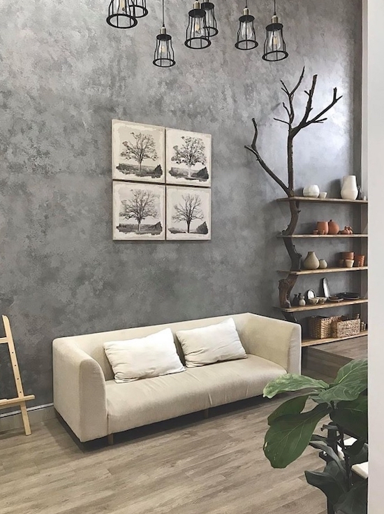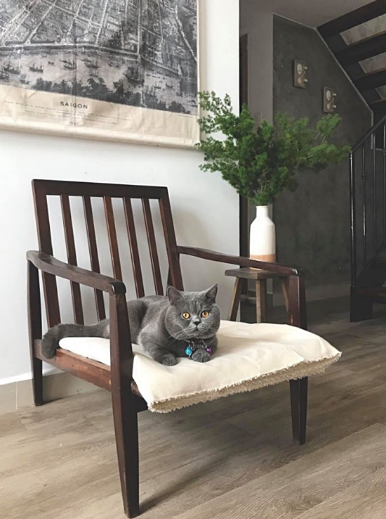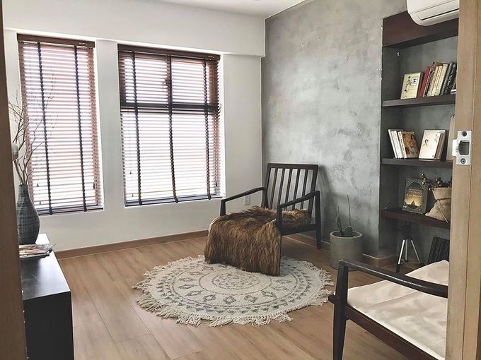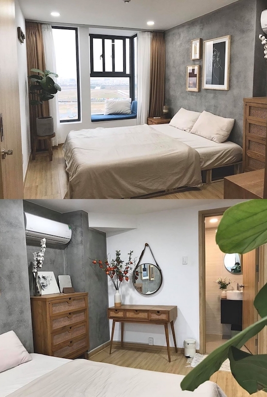 Tường sơn giả xi măng phối trắng tạo cảm giác nhà sáng hơn nhưng hơi lạnh. Để cân bằng lại, gia chủ dùng nội thất gỗ màu nguyên bản và rèm cửa màu nâu.