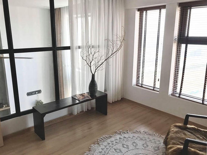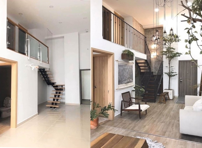 Khi bàn giao, căn nhà trống, tường sơn trắng toàn bộ, sàn gạch men, cầu thang trụ sắt kết hợp inox và lan can kính cường lực khá thô. Chị Thái Hòa quyết định ở tạm một thời gian, sau đó tự thiết kế lại căn hộ với mục tiêu không gian sống đơn giản mà gần gũi và thân thiện, tiện ích vừa đủ nhưng thoáng mát, tiết kiệm cả diện tích lẫn chi phí.