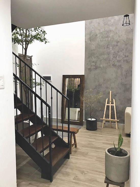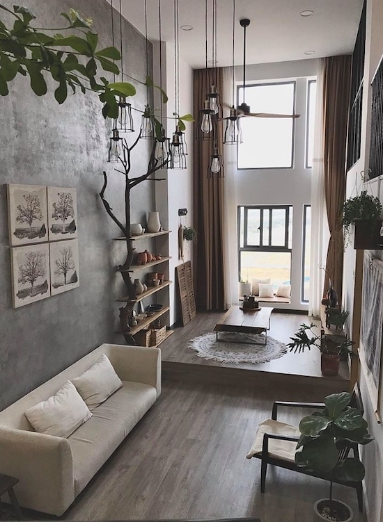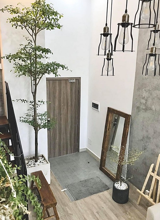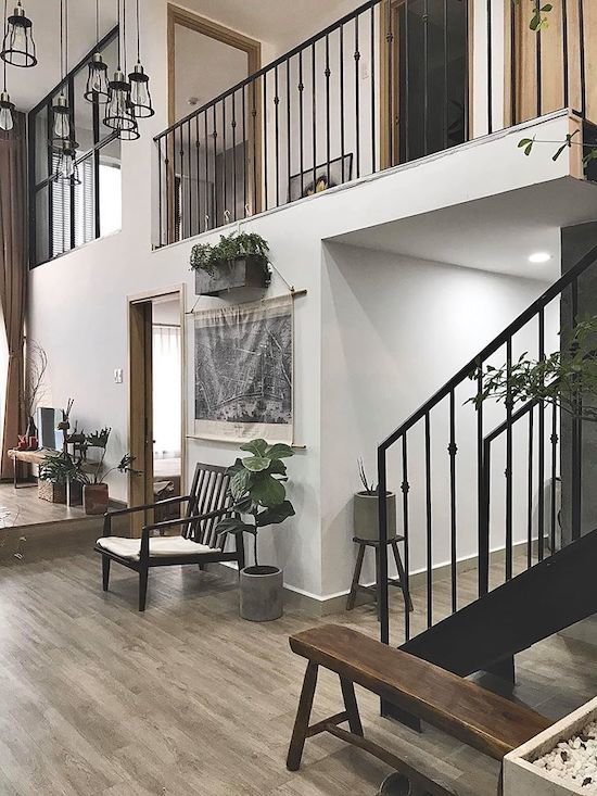 Cây xanh xuất hiện ở mọi ngóc ngách nhà, giúp thư giãn tinh thần và góp phần lọc không khí. Do trần cao mà diện tích căn hộ hẹp, gia chủ đặt chậu cây lớn bên cầu thang và lắp đèn thả trần, quạt trần nhằm cân đối không gian.