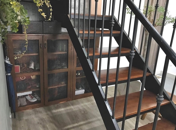 Chạn bát cũ nay trở thành tủ giầy của gia đình, để dưới cầu thang để tiết kiệm diện tích.