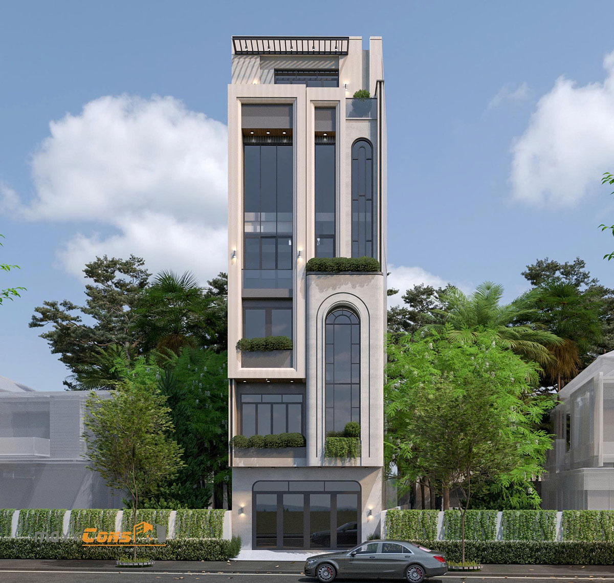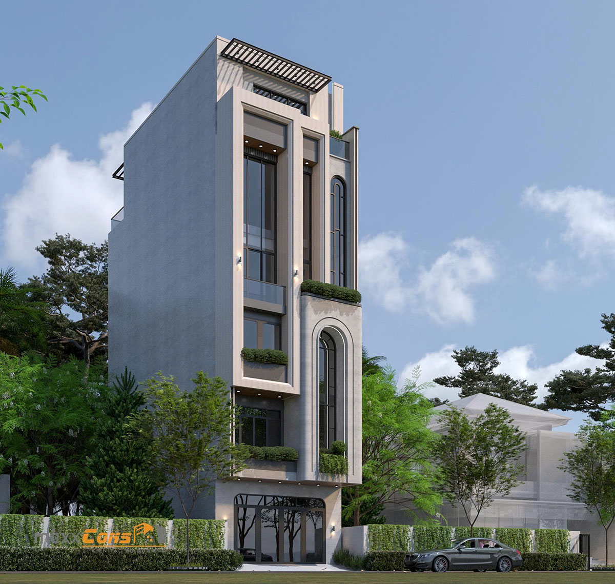 Đặc biệt, điểm nhấn của thiết kế chính là khối cửa vòm cao vút ở tầng hai – một chi tiết không chỉ đẹp mắt mà còn gợi mở cảm hứng cổ điển nhẹ nhàng giữa kiến trúc hiện đại. Sự xuất hiện của đường cong này như một cú chấm phá nghệ thuật, tạo nên chiều sâu và cảm xúc cho toàn bộ mặt tiền.