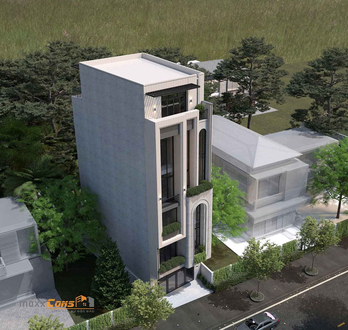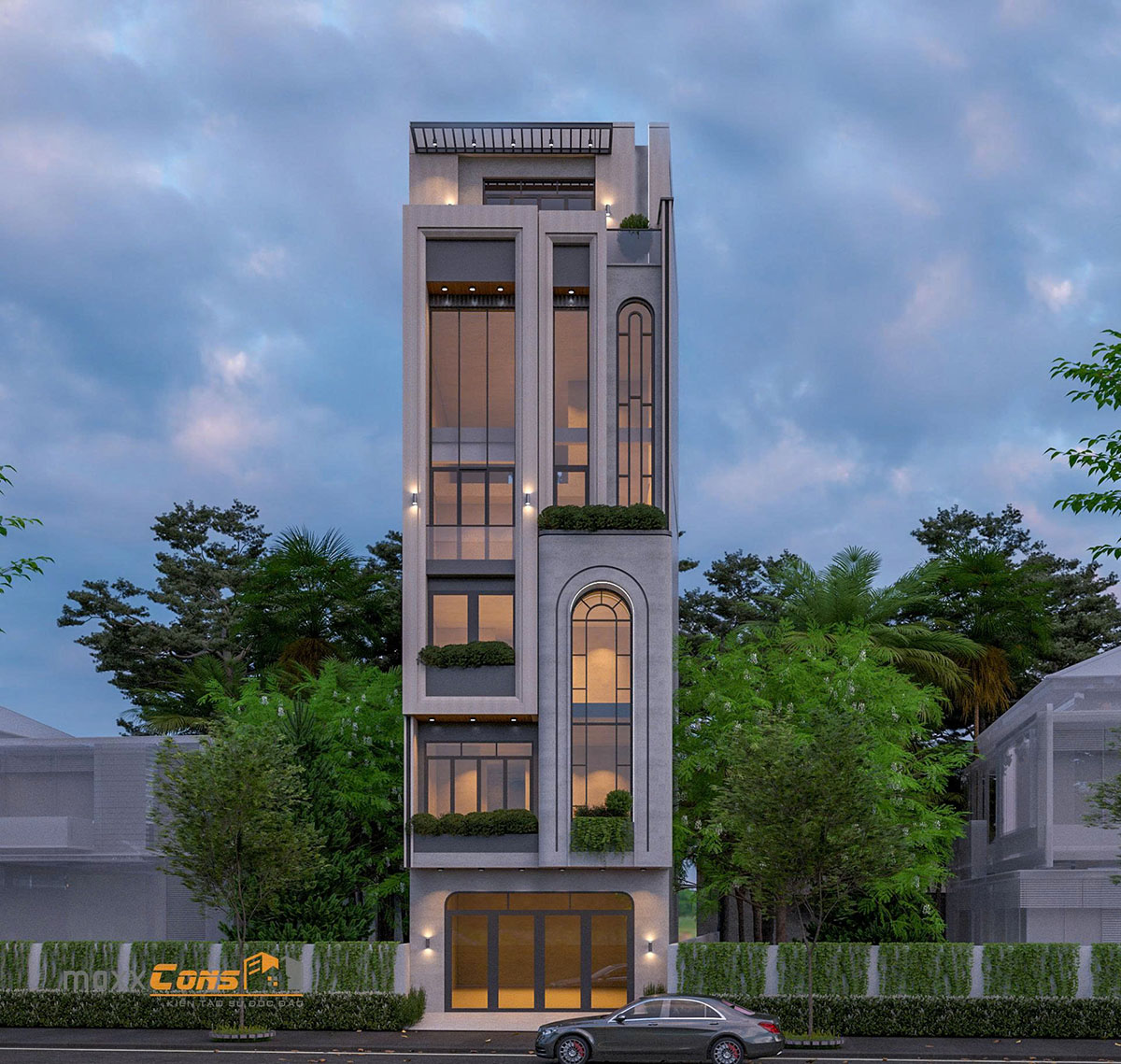 Vật liệu là yếu tố then chốt tạo nên sức sống và độ bền vững cho công trình. maxxCons lựa chọn tông màu xám nhạt chủ đạo, kết hợp bê tông sơn giả đá, kính cường lực và các chi tiết ốp kim loại tối màu. Tất cả tạo nên diện mạo sang trọng, chỉn chu và thanh lịch – đúng với tinh thần của một không gian sống đô thị thế hệ mới.
