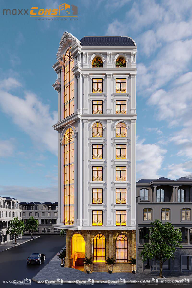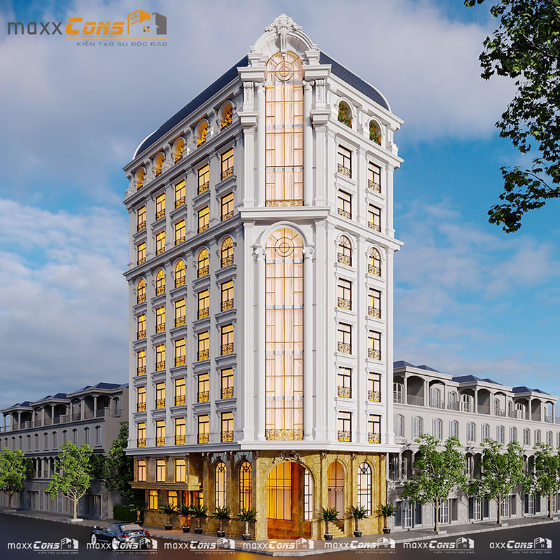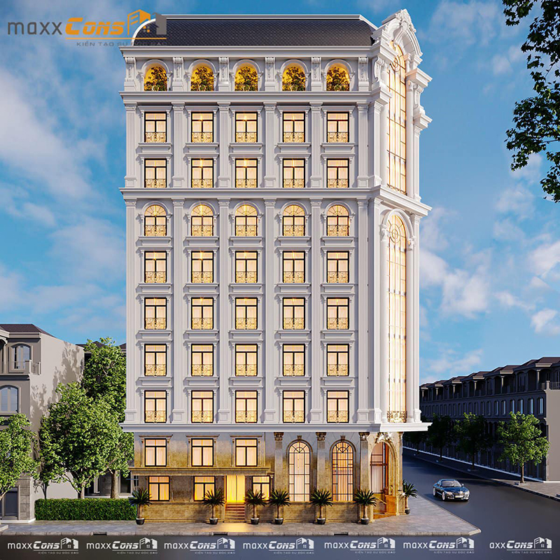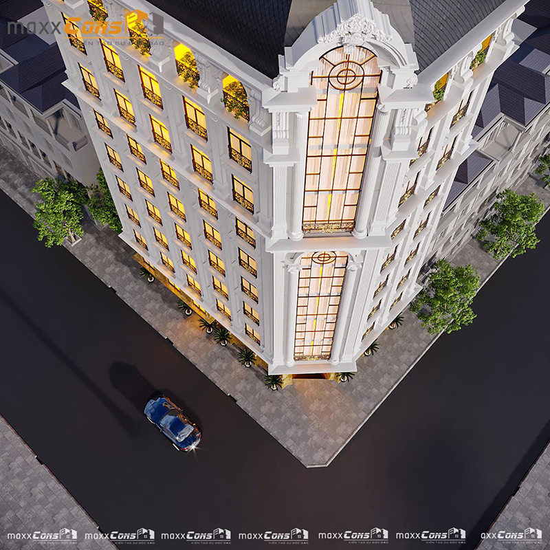 Kiến trúc maxxCons tiếp tục mang đến cho quý khách hàng một kiến trúc cổ điển Pháp khách sạn 9 tầng tại Bắc Giang, Công trình nổi bật với thiết kế phong cách tân cổ điển đẹp nhẹ nhàng với hai mặt tiền đẹp lạ mắt. Công trình là sự sáng tạo không ngừng nghỉ của các kiến trúc sư maxxCons hãy cùng tham khảo công trình qua những hình ảnh 3D dưới đây nhé