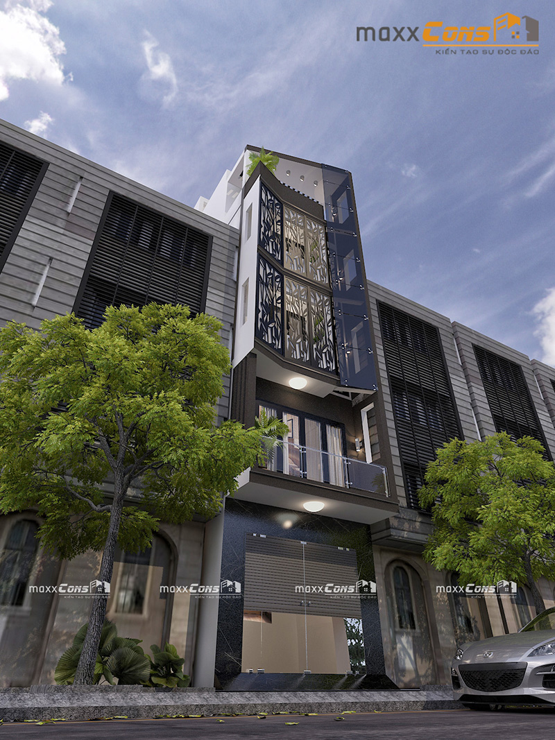 Đặc điểm nổi bật của phong cách thiết kế nhà phố hiện đại chính là sự tối giản các chi tiết rườm rà và đầu tư tính thẩm mỹ cho mặt tiền. Phương án xử lý mặt tiền thông minh và phổ biến cho nhà phố hiện đại là sử dụng hình khối, đường chỉ ngang, sắp đặt mảng, miếng theo chiều ngang để đánh lừa thị giác, xóa bỏ cảm giác hẹp và cao vút, giúp ngôi nhà trông rộng hơn. Đặc biệt hơn mẫu nhà phố này khá độc đáo với mặt tiền được sử dụng các hoa văn đen tinh sảo mang cảm giác rộng hơn
