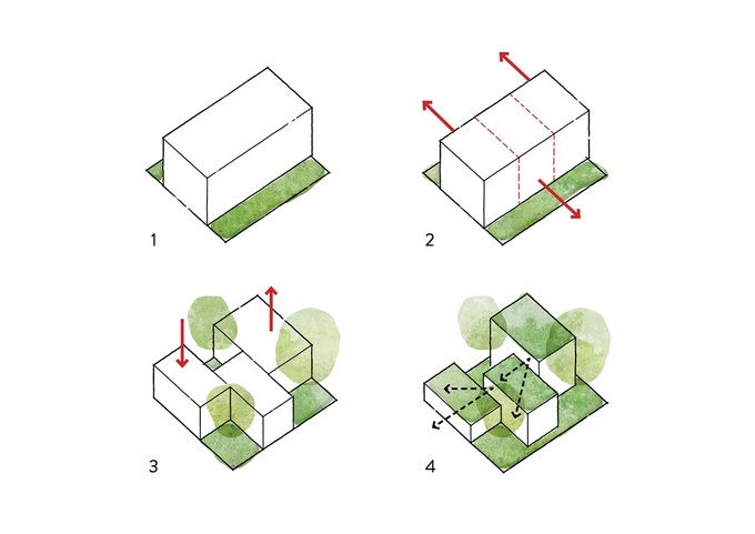 Để đáp ứng yêu cầu trên, các kiến trúc sư đề xuất thiết kế với ba khối nhà xen kẽ những mảnh vườn. Ba khối nhà xếp so le, từ thấp đến cao như những bậc thang. Mái từng khối được tận dụng để trồng cây.