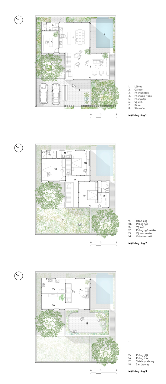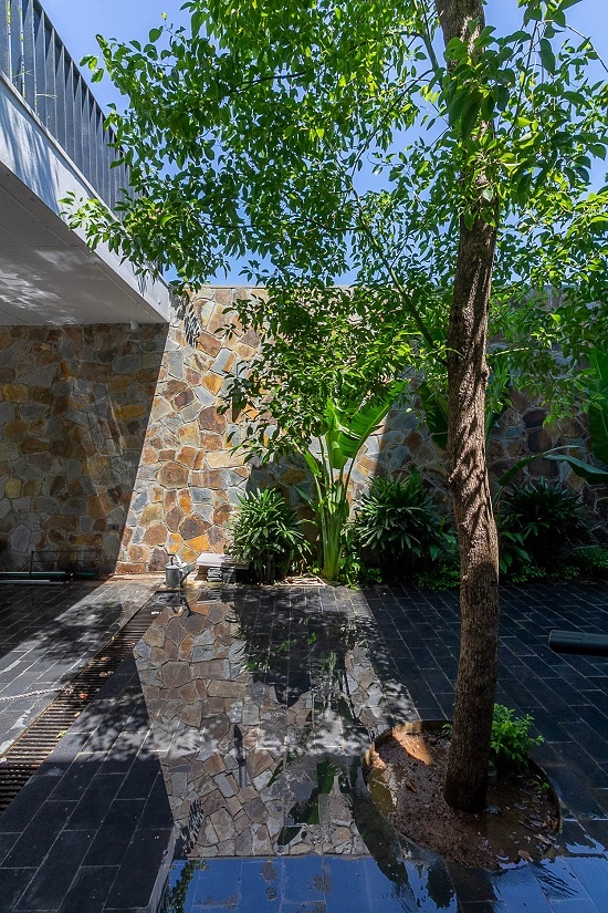 Khoảng không gian trống giữa các khối nhà dùng làm vườn cây, hồ cá. Chúng vừa điều hòa ánh sáng và gió, tránh nắng gắt vừa tạo cảnh quan đẹp khi nhìn từ trong nhà ra.