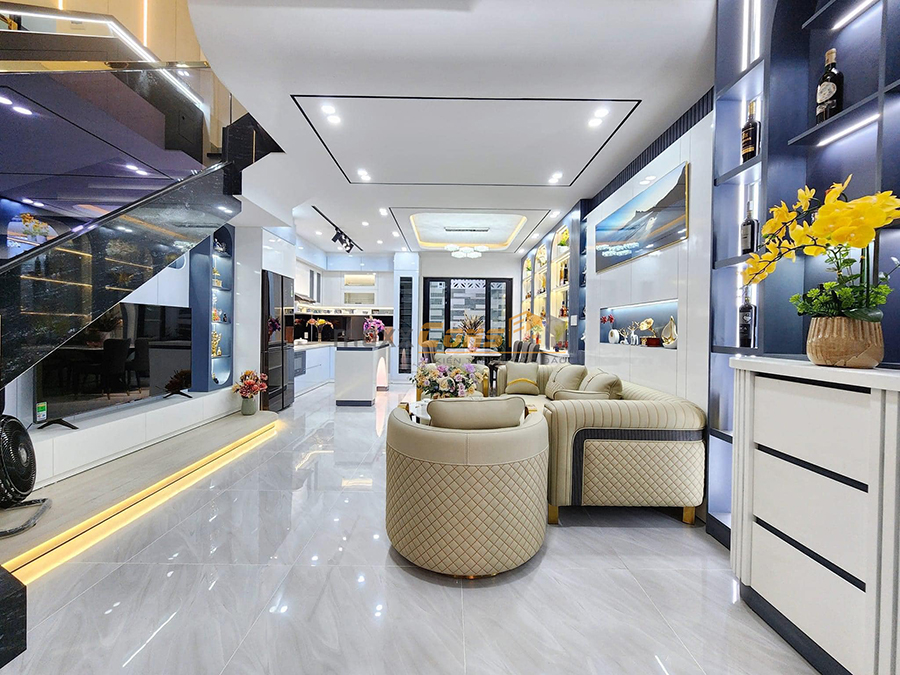 Phòng khách: Trang trí với các đồ nội thất cao cấp, đèn chùm lớn, ghế sofa bọc da hoặc nỉ, bàn trà bằng gỗ hoặc kính. Màu sắc chủ đạo thường là trắng, vàng nhạt hoặc các tông màu ấm.