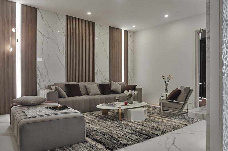 Riêng góc sinh hoạt chung được kết nối với hành lang rộng rãi, tạo cảm giác ấm cúng nhưng không bí bách.