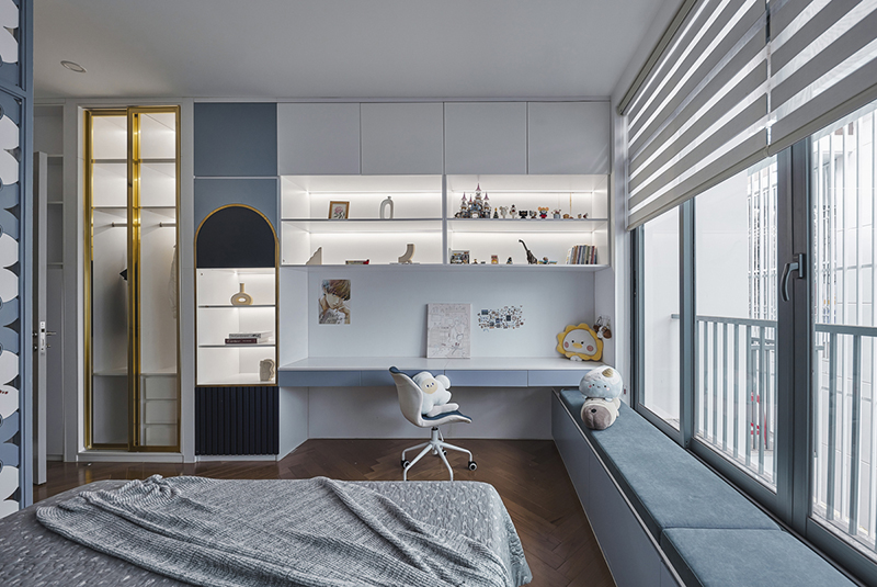 Phòng ngủ con được thiết kế không gian thoáng và đủ sáng. Hàng ghế thư giãn cạnh cửa sổ là nơi các bạn nhỏ có thể đọc sách hoặc thư giãn.