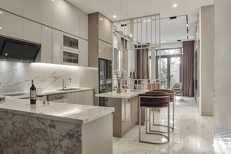 Nội thất của ngôi nhà được thiết kế phong cách hiện đại. Phòng bếp rộng rãi, đầy đủ tiện nghi để đáp ứng nhu cầu của các thành viên trong gia đình. Ngoài bàn ăn, kiến trúc sư cũng bổ sung thêm bàn đảo để gia chủ có thể thưởng thức món ngon tại bếp.