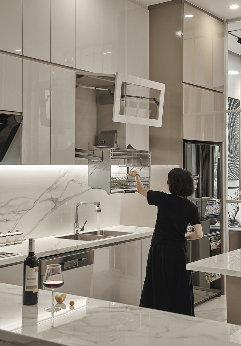 Kệ úp bát đĩa có lắp đặt hệ ray trượt nâng hạ, giúp cả gia đình, đặc biệt là các thành viên lớn tuổi thuận tiện sinh hoạt.