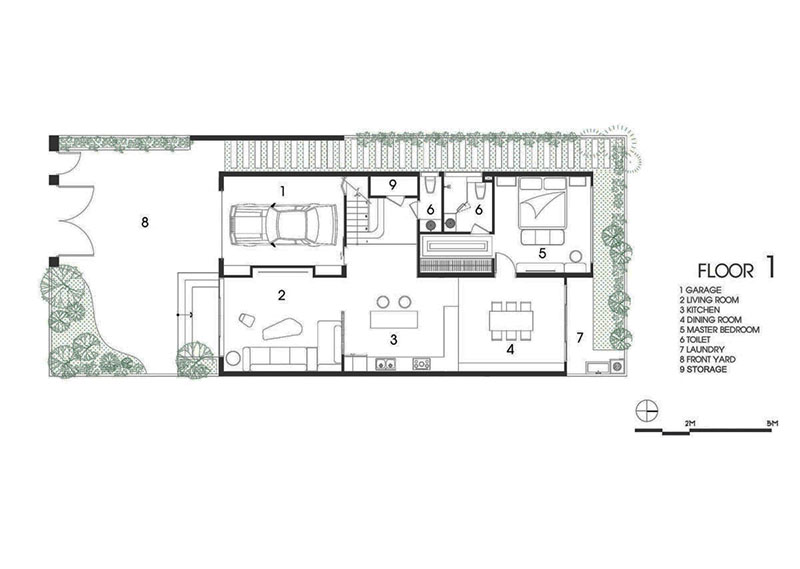 Khoảng sân vườn trước và sau được kết nối với bên trong nhà thông qua hệ cửa kính rộng mở, nhằm mang đến sự thoáng đãng và gần gũi thiên nhiên.