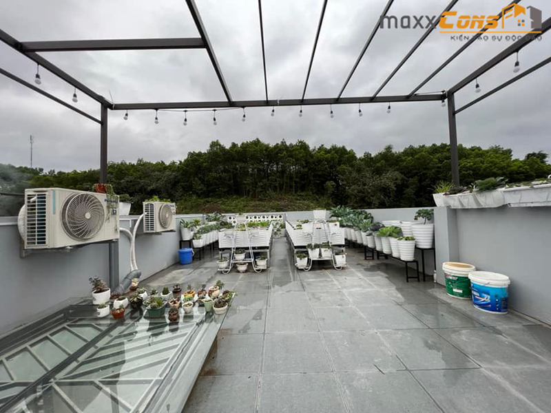 Không gian sân thượng được sắp xếp với 4 dãy trồng rau xanh cùng với những chậu cây cảnh đẹp mắt.