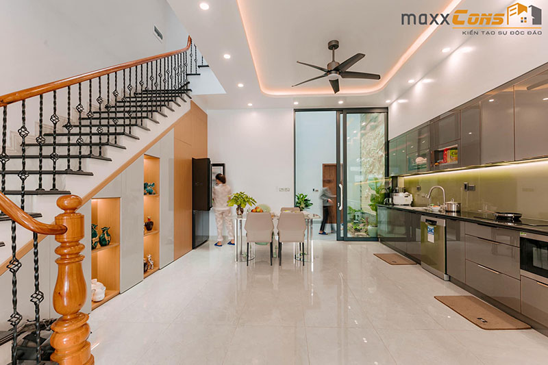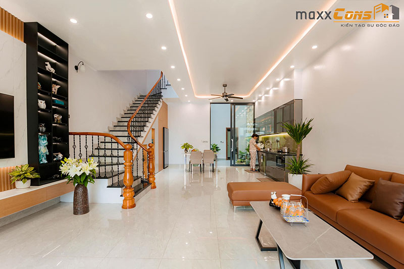 Phòng khách liền với khu vực bếp và bàn ăn. Toàn bộ căn nhà mình chọn ánh sáng trung tính, đủ ấm áp cho cả mùa đông lẫn ấm cúng cho mùa hè. Do bố trí cả Phòng Ngủ ở tầng 1 cho bà nội nên không bố trí được quá nhiều không gian xanh ở cuối nhà.