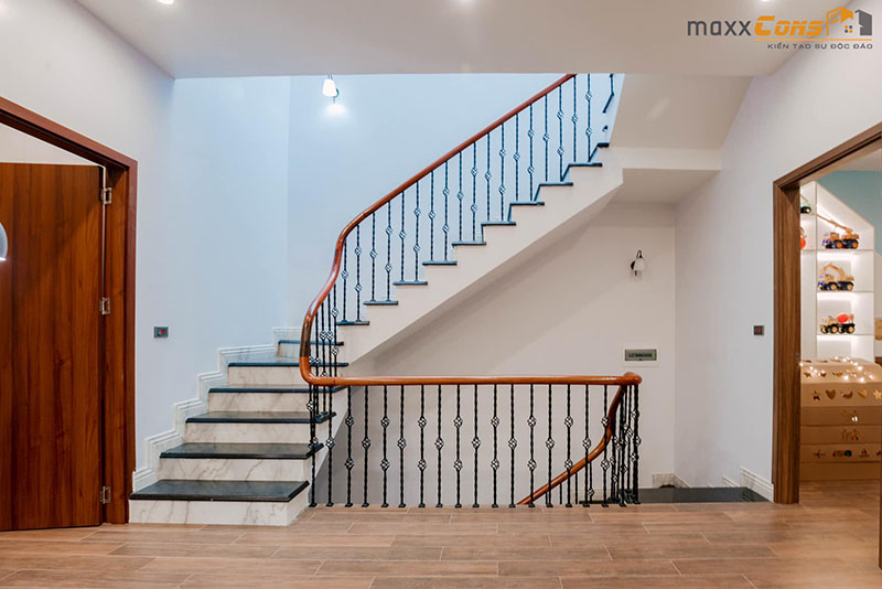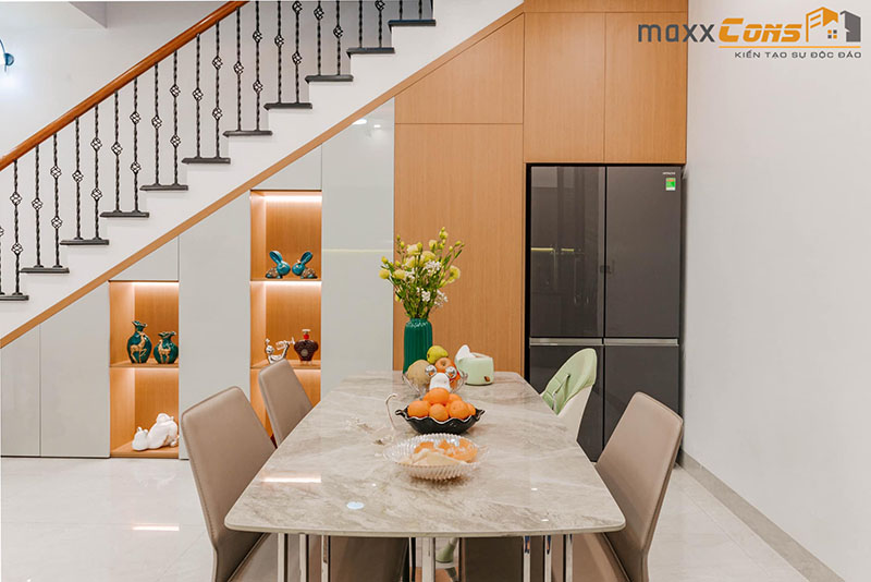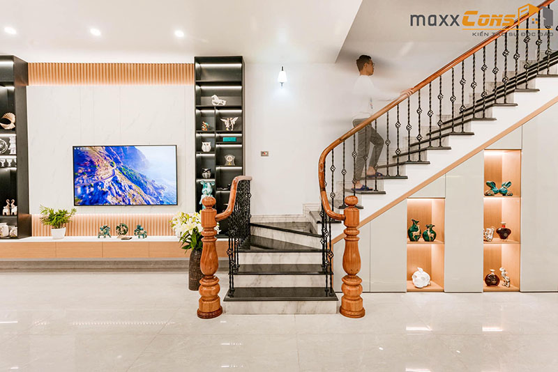 Khu vực gầm thang được tận dụng làm nơi chưa đồ và tủ giầy