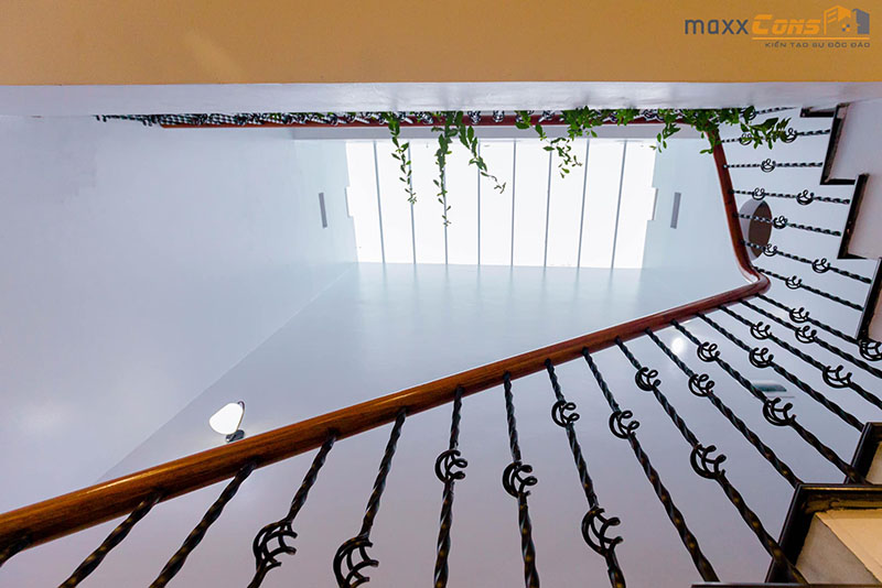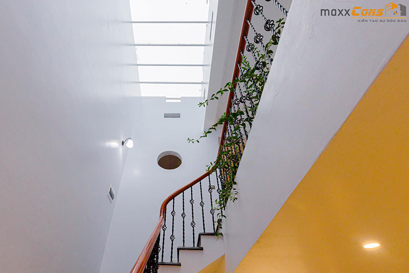 Cầu thang lên tầng 3 với mái kính lấy sáng. Phía sau cuối là sân phơi đồ cùng khu giặt sấy