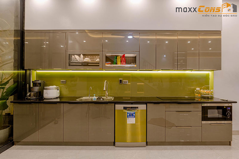 Hệ bếp với vật liệu inox cánh kính. Chậu rửa loại 1 hố là sáng suốt của bà xã khi tha hồ lau rửa mà không lo chật chội. Máy rửa bát Bosch vẫn chưa bóc seal cửa do nhóc nhà mình hiếu động nên sợ tróc xước bếp, lò âm tủ của Malloca. Riêng hút mùi của Malloca âm hoàn toàn nên rất thẩm mỹ