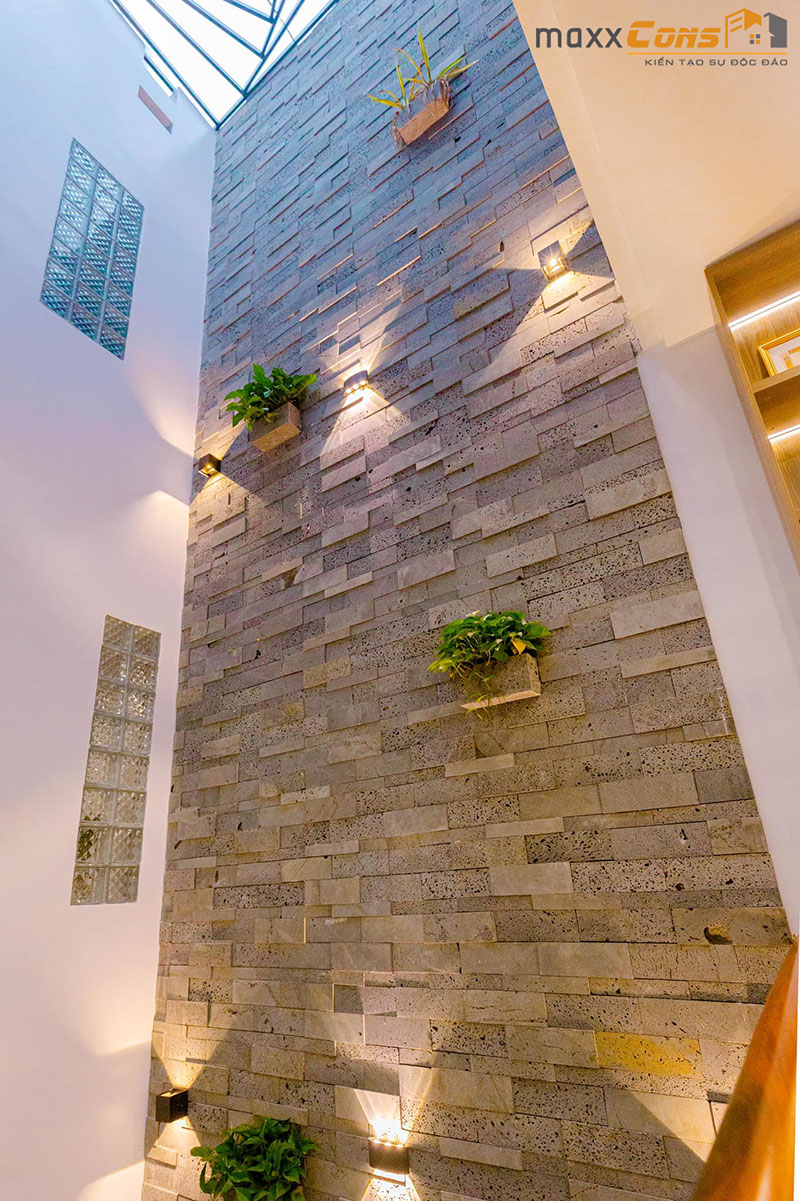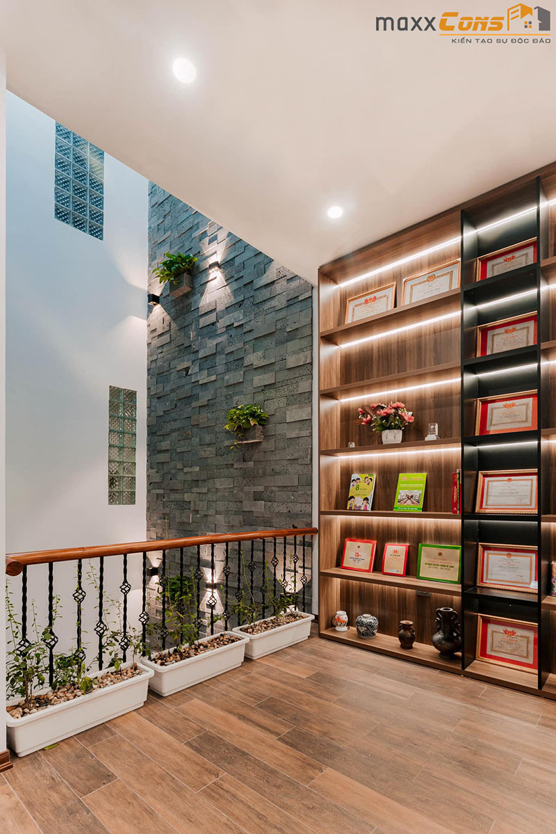 Với thiết kế hiện đại định hình style thanh thoát, gọn gàng, vật liệu nội thất cơ bản là gỗ CN An Cường, riêng PN của 2v/c lựa chọn Gỗ óc chó, PN của bà nội cùng phòng thờ là gỗ tự nhiên. Bậc cầu thang bằng đá, Sơn MyKolor cả ngoại + nội thất, riêng hiệu ứng bê tông dùng sơn Vasari. Bố trí 1 giếng trời giữa nhà để điều hoà không khí và thêm chút cây xanh và tiểu cảnh trong nhà.Tổng hoàn thiện công trình ~2.8 tỉ