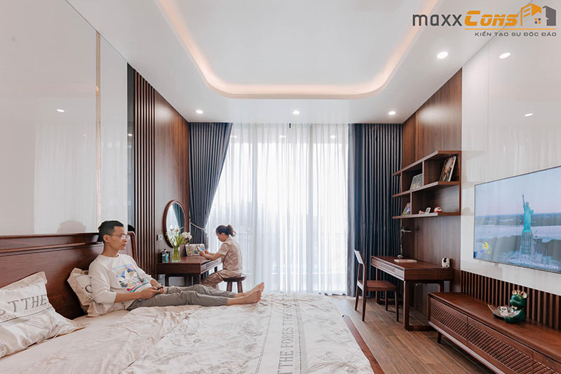 Phòng ngủ master của 2 vợ chồng chủ nhà, Toàn bộ tầng 2 + 3 mình chọn lát gạch vân gỗ của Eurotiles