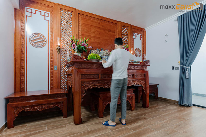 Phòng thờ được làm toàn bộ gỗ hương sang trọng trang nghiêm