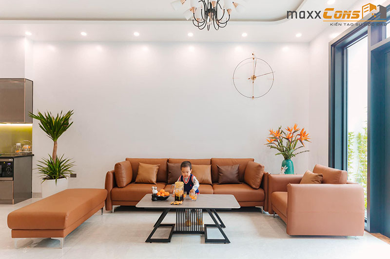 PK gọn gàng, với sofa da mình chọn màu nâu cho sạch sẽ, đồng hồ decor và đèn chùm tự order China. Hệ cửa nhôm của BLK mình lựa option bản cánh 65 x 150 bề thế, đảm bảo an toàn và cũng tạo sự vững chãi cho căn nhà ngay từ khi bước chân vào