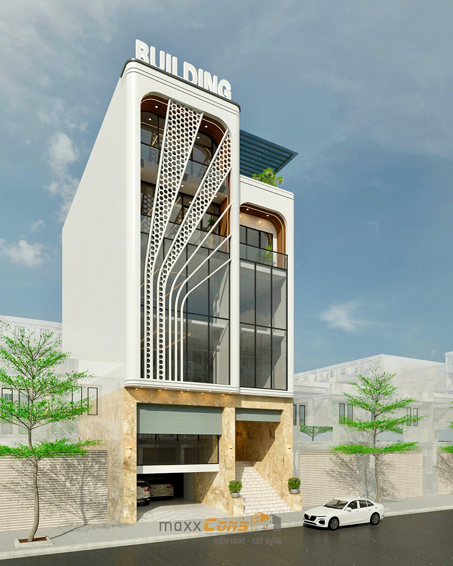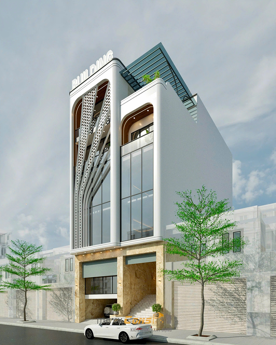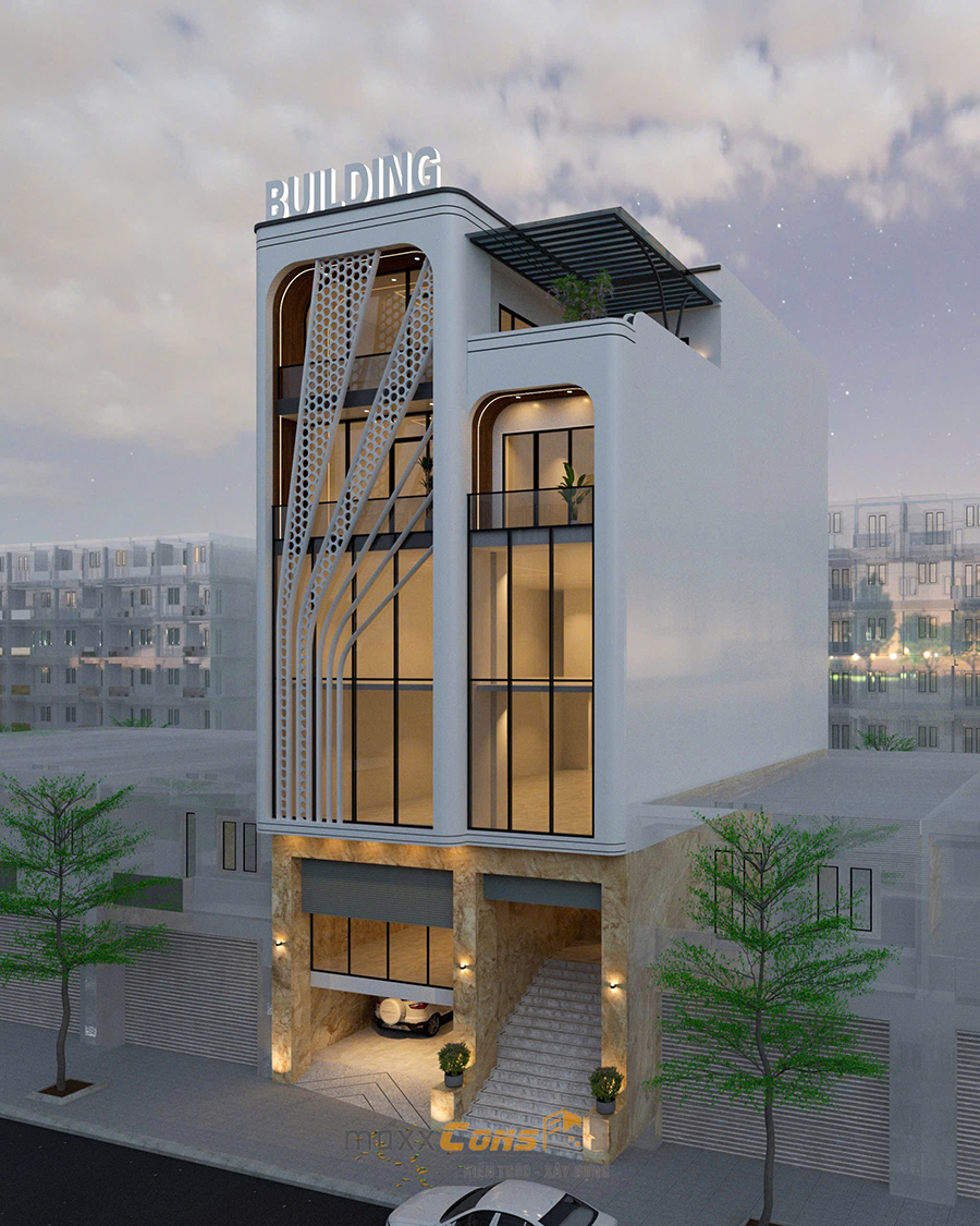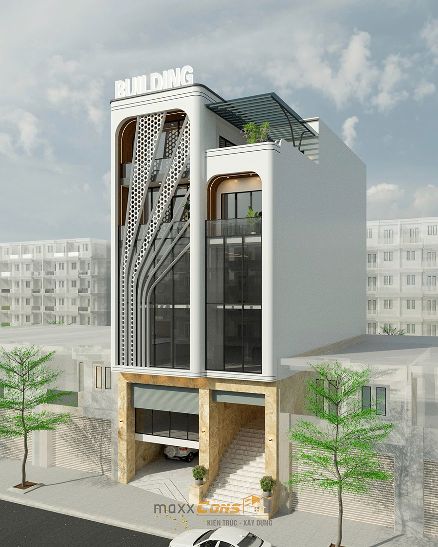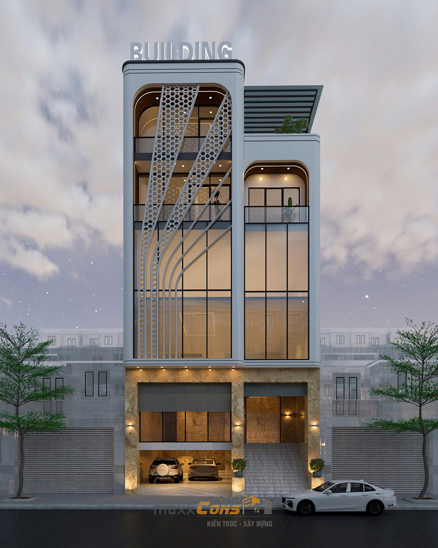 Công trình sử dụng các hình khối vuông vức, kết hợp với những đường cong mềm mại ở mặt tiền để tạo sự cân bằng trong thiết kế. Từ tầng trệt đến các tầng trên, từng chi tiết đều được chăm chút kỹ lưỡng nhằm tạo nên một tổng thể hài hòa và cuốn hút.
