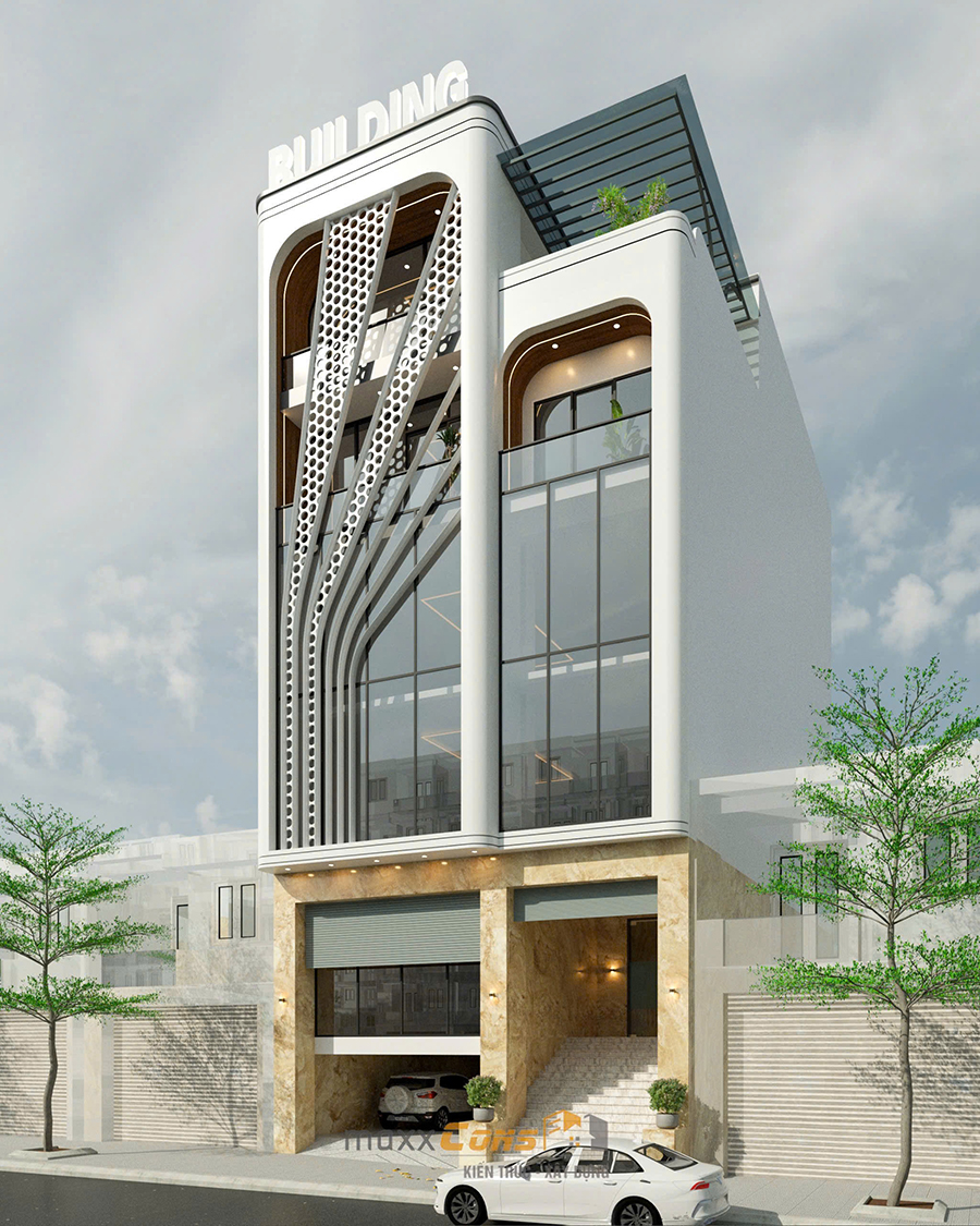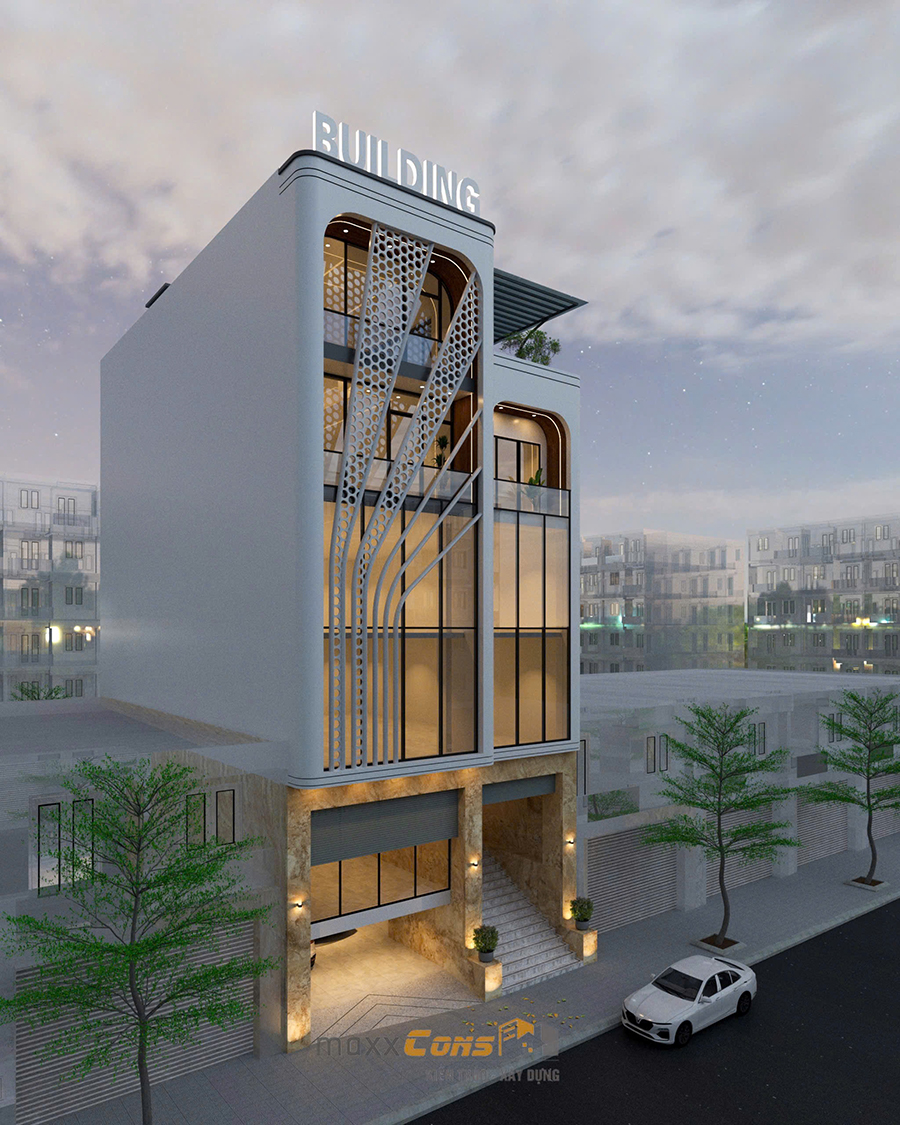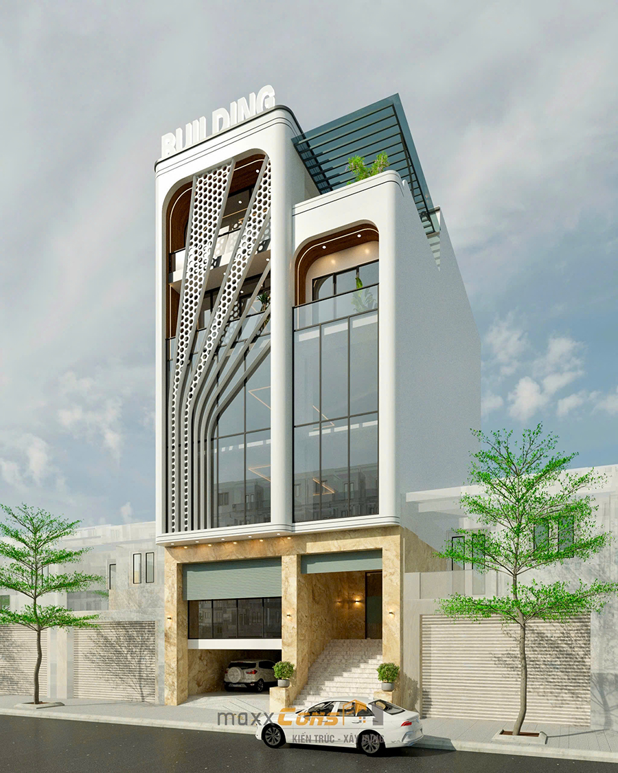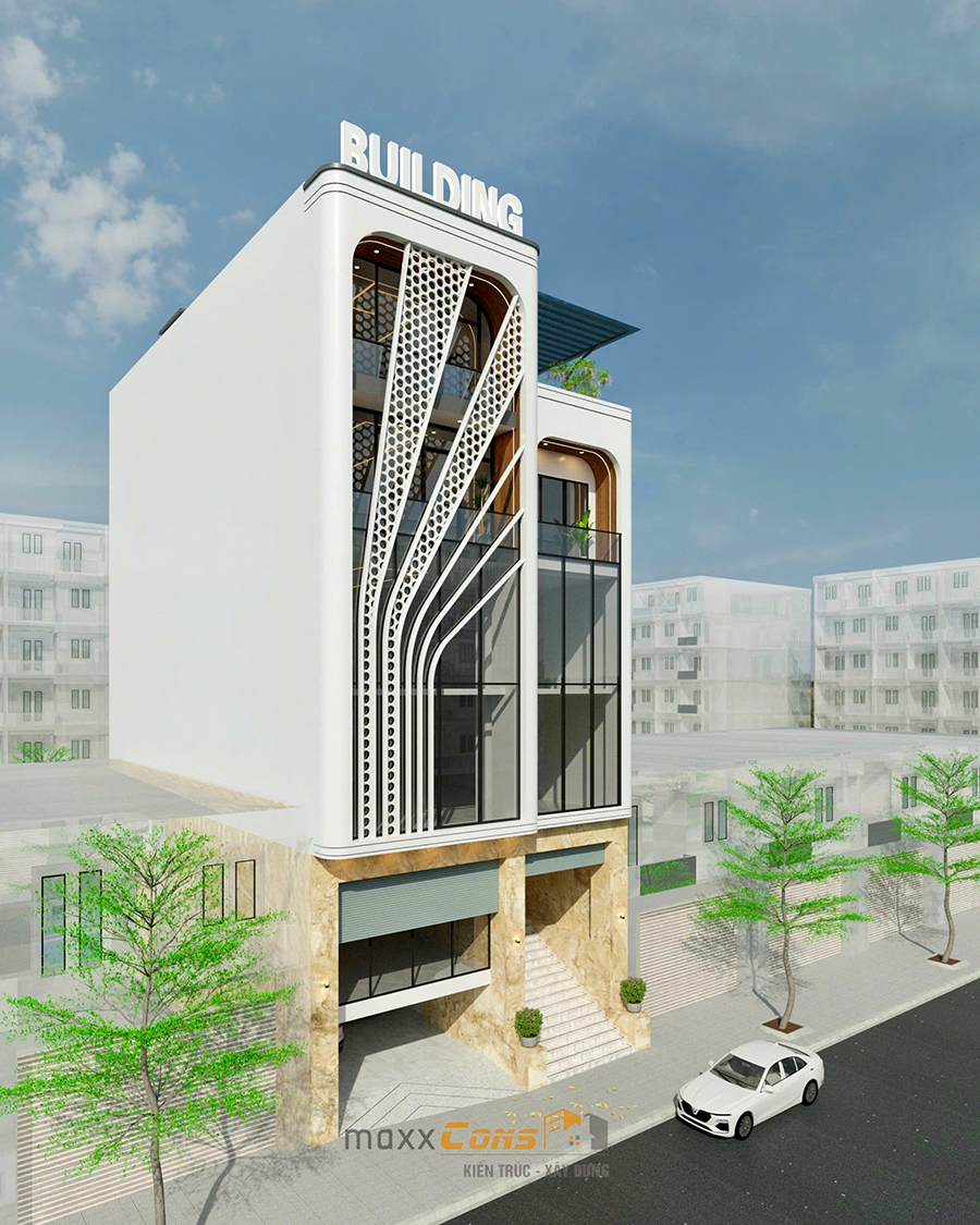 Công trình sử dụng các hình khối vuông vức, kết hợp với những đường cong mềm mại ở mặt tiền để tạo sự cân bằng trong thiết kế. Từ tầng trệt đến các tầng trên, từng chi tiết đều được chăm chút kỹ lưỡng nhằm tạo nên một tổng thể hài hòa và cuốn hút.