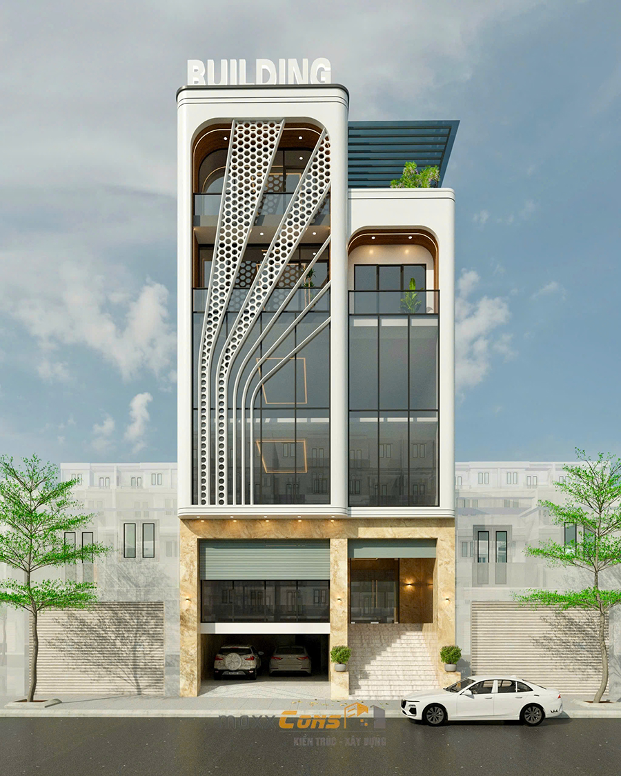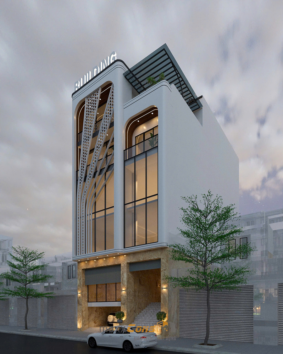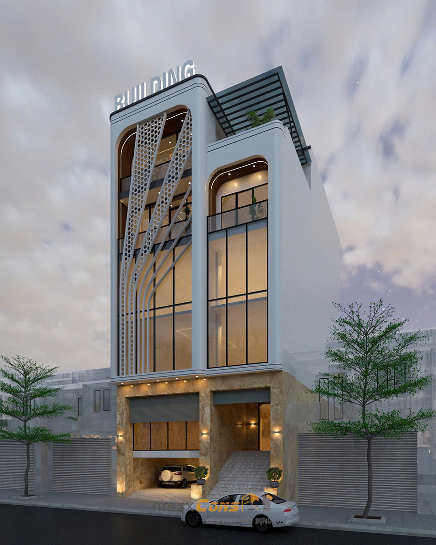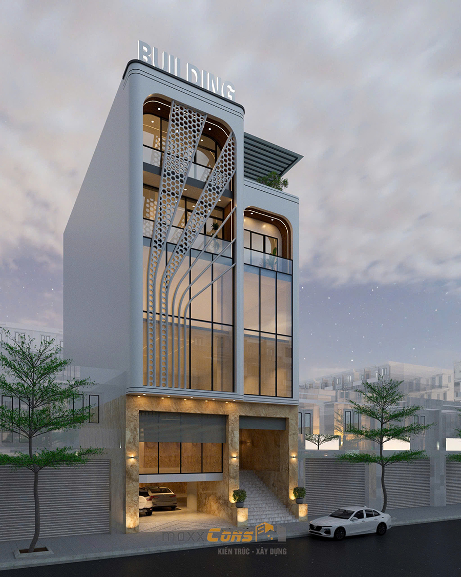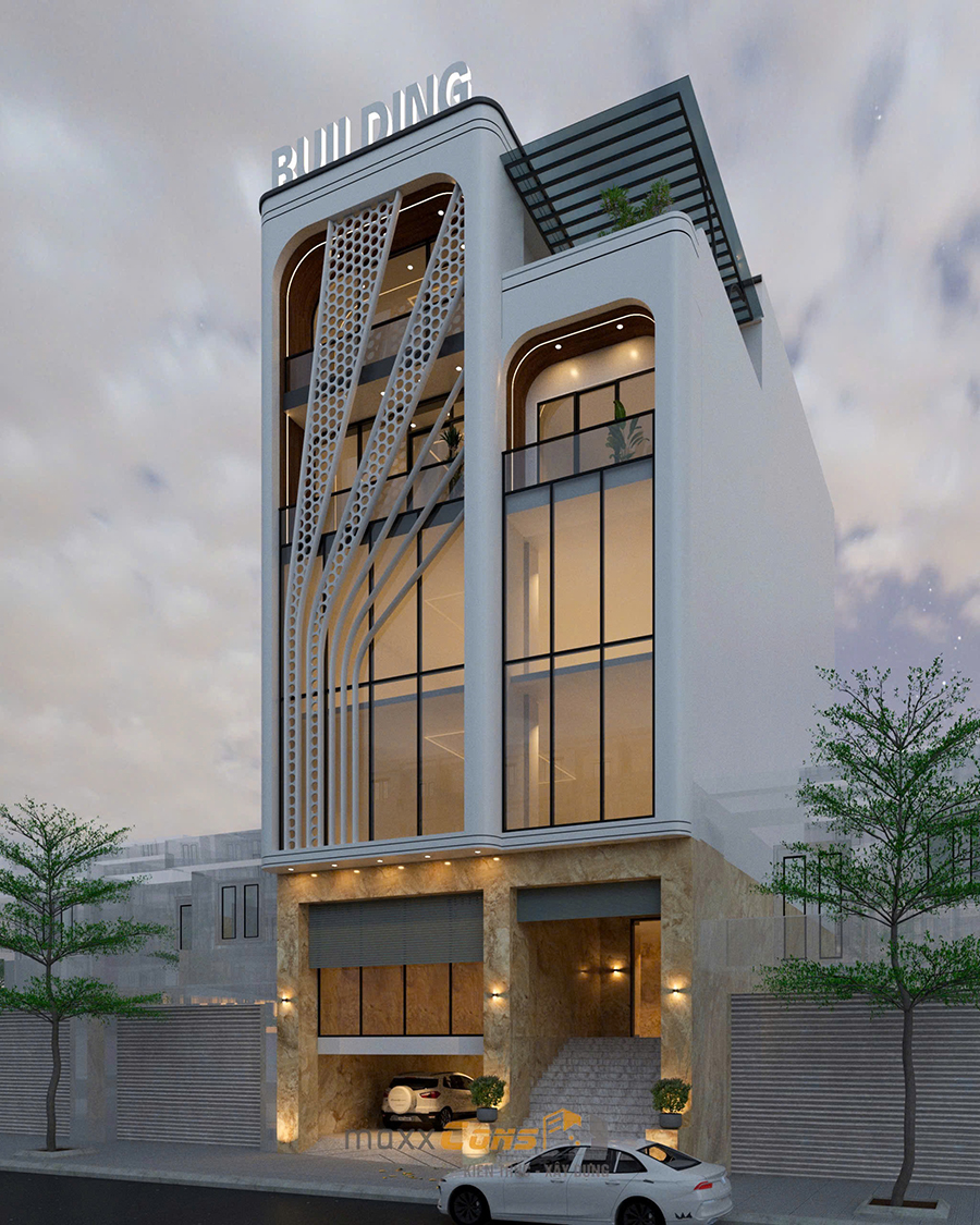 Công trình sử dụng các hình khối vuông vức, kết hợp với những đường cong mềm mại ở mặt tiền để tạo sự cân bằng trong thiết kế. Từ tầng trệt đến các tầng trên, từng chi tiết đều được chăm chút kỹ lưỡng nhằm tạo nên một tổng thể hài hòa và cuốn hút.