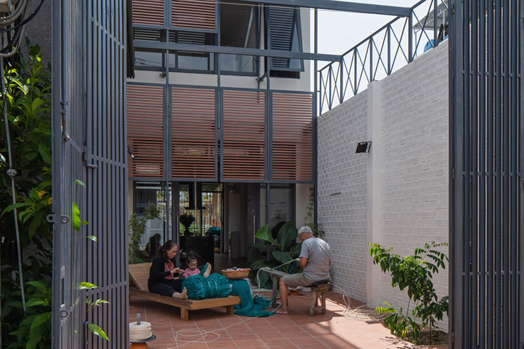 Diện tích xây dựng chỉ chiếm khoảng một phần ba khu đất, còn lại dành chỗ cho sân trước và sân sau. Tại những khoảng sân này, các thành viên quây quần bên nhau, người lớn đan lưới còn trẻ con chơi đùa.