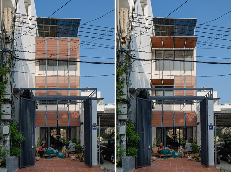 Nhà hướng Tây, lợi thế là đón được gió Tây Nam - nguồn gió chính ở Việt Nam nhưng chịu bức xạ nhiệt vào buổi chiều. Để giải quyết vấn đề đó, nhóm thiết kế bố trí một hệ lam có cấu trúc động.