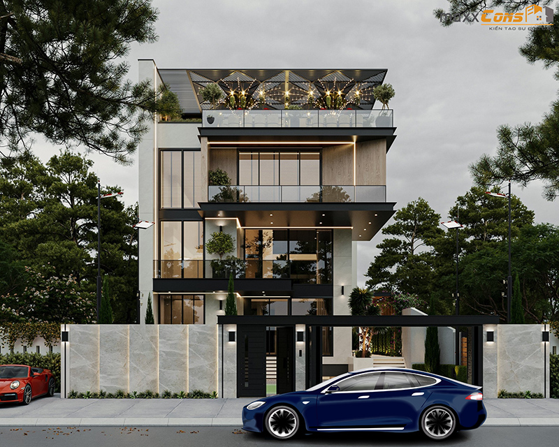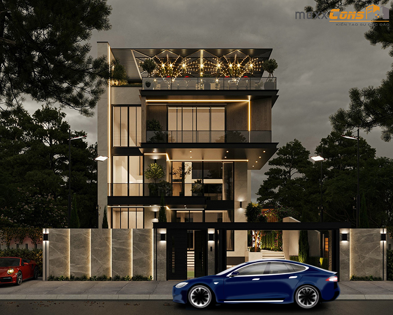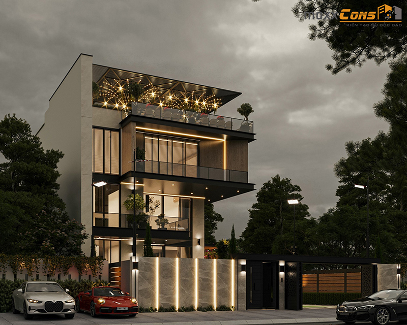 Biệt thự hiện đại 3 tầng 1 tum lấp lánh vào buổi tối dưới ánh đèn led được lắp đặt nổi rõ khung viền mặt tiền ngôi biệt thự nhằm tăng lên độ sắc nét sang trọng và đẳng cấp của căn nhà này