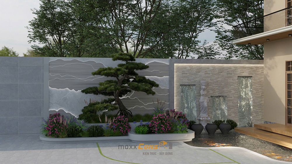 Một trong những yếu tố làm nên sự khác biệt của biệt thự này chính là việc chú trọng vào không gian ngoại thất, giúp tạo dựng một diện mạo sang trọng và hiện đại. Cảnh quan xung quanh biệt thự được thiết kế tinh tế với các chi tiết như thác nước, cây cối và những bức tường tạo điểm nhấn. Việc sử dụng các vật liệu như đá tự nhiên, kính, và gỗ không chỉ mang lại vẻ đẹp thẩm mỹ mà còn giúp tăng cường độ bền cho công trình.