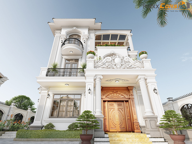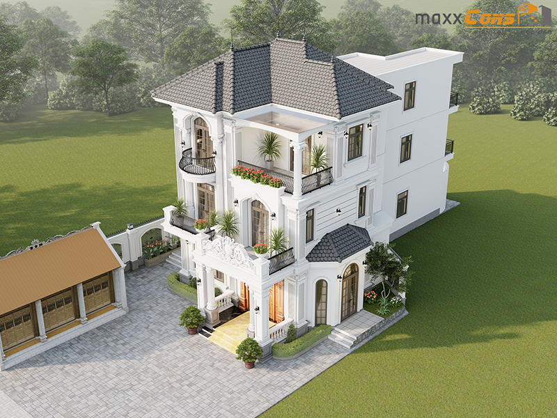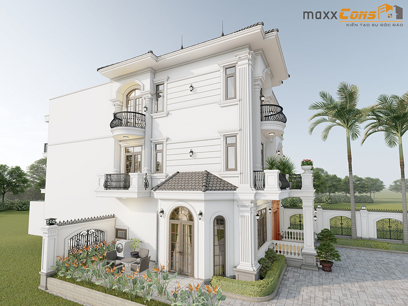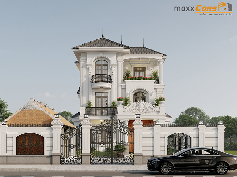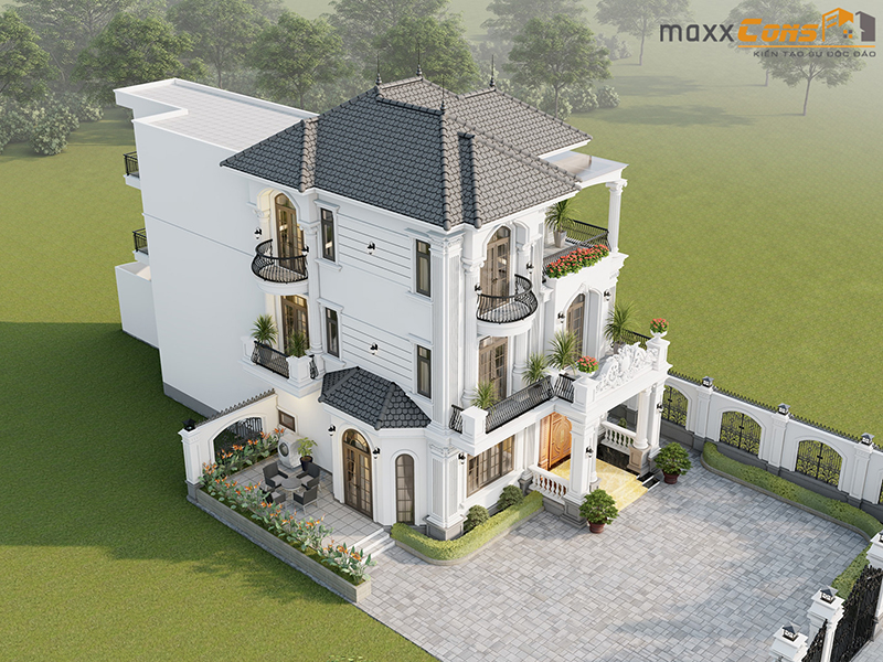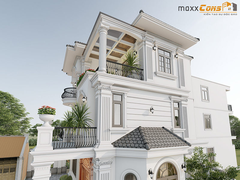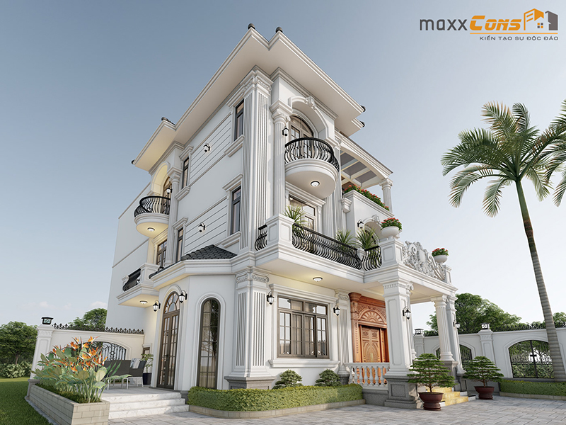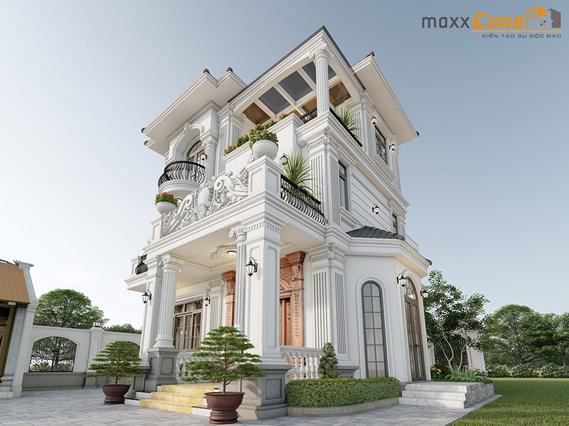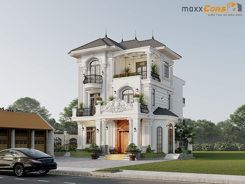 Kiến trúc maxxCons giới thiệu với độc giả mẫu biệt thự tân cổ điển 8x20m 3 tầng ấn tượng sang trọng bắt mắt với hệ mái thái tone màu ghi kết hợp với phối cảnh mặt tiền sơn trắng hoa văn hoạ tiết độc đáo và đặc sắc đã toát lên sự đẳng cấp sang trọng của căn biệt thự này.