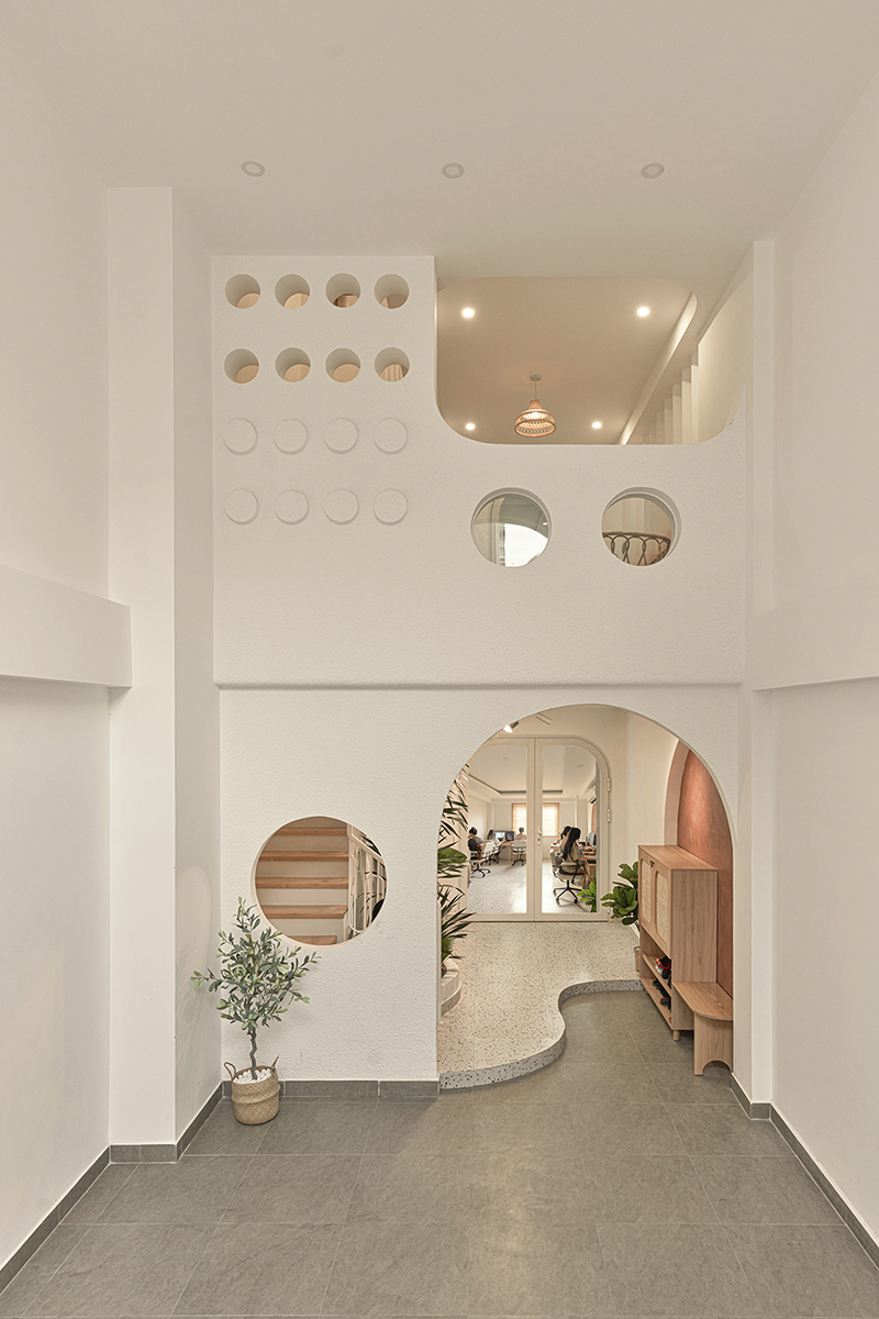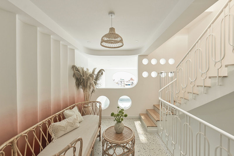 Những ô tròn xuất hiện liên tục trong nhà ngoài tạo tính thẩm mỹ, còn là những vị trí lấy sáng và gió tự nhiên, đảm bảo không gian luôn thông thoáng, mát mẻ.