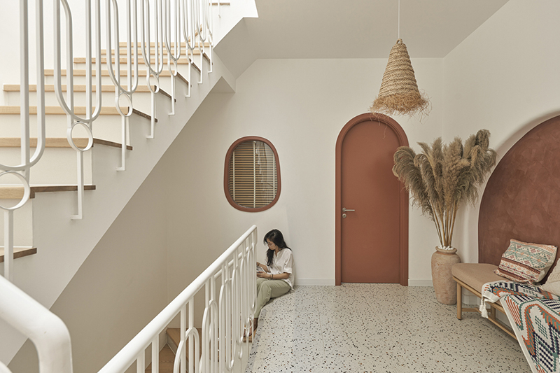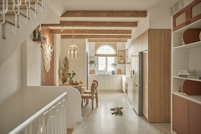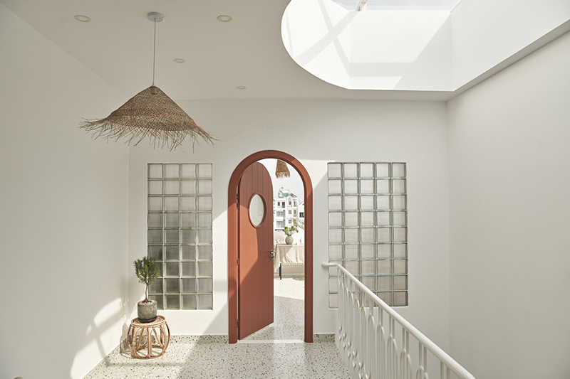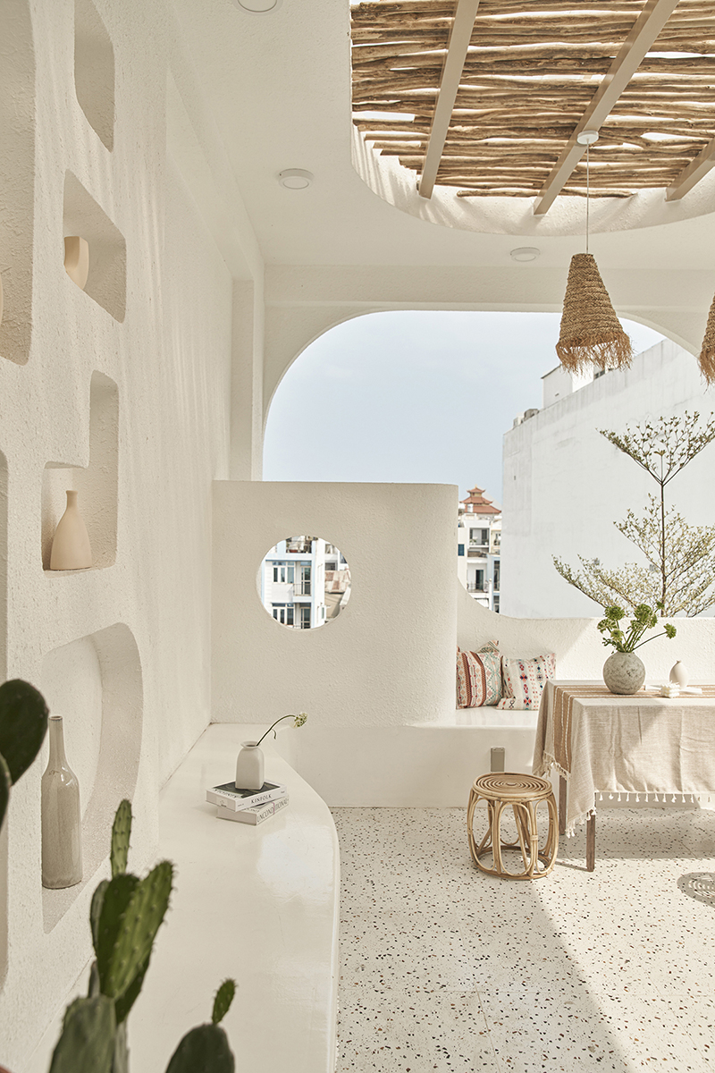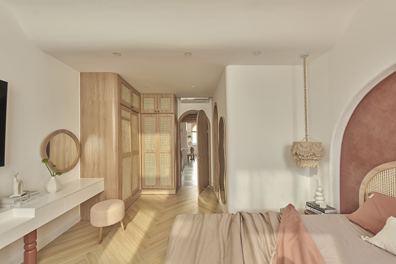 Những chi tiết theo phong cách Địa Trung Hải được thể hiện ở khung cửa vòm, đà gỗ, sơn hiệu ứng đất nung và những chiếc đèn trang trí với kỹ thuật đan macrame... tạo nên không gian bình yên mà không nhàm chán.
