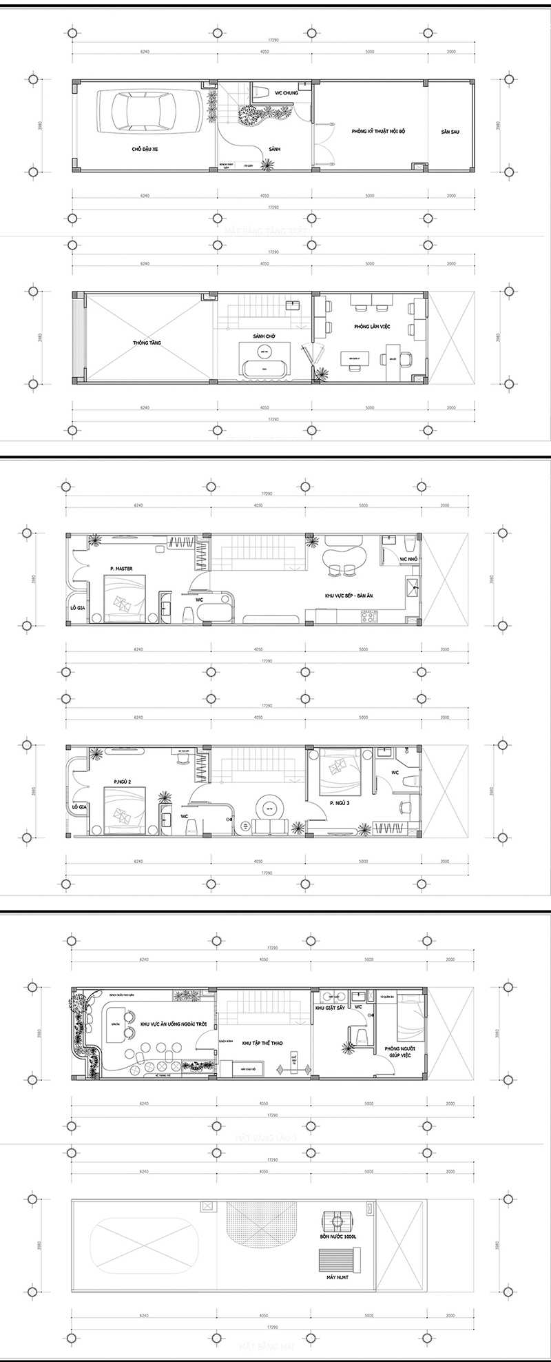 Tầng trệt và lửng dùng làm không gian cho văn phòng, tầng một là nhà bếp và phòng ngủ master, tầng hai là phòng ngủ cho con trai và khách, sân thượng là nơi tụ họp bạn bè.