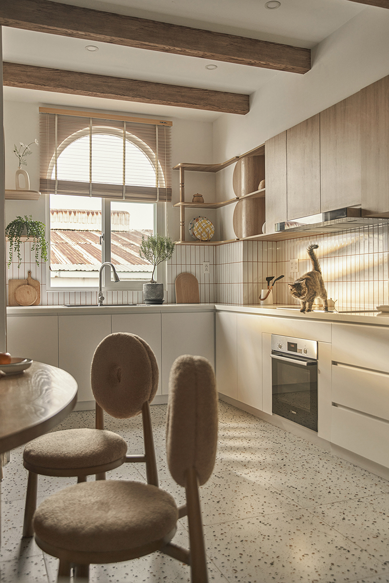 Khu vực bếp được thiết kế đón nắng và gió trời từ cửa sổ khiến căn nhà lúc nào cũng ngập tràn ánh sáng.